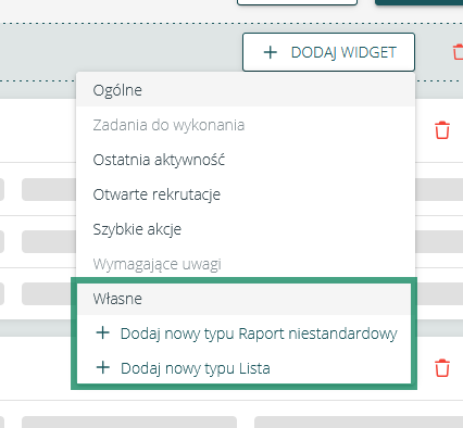 Aby utworzyć nowy widget należy skorzystać z opcji “DODAJ WIDGET” w sekcji, w ramach której chcemy aby widget się pojawił.