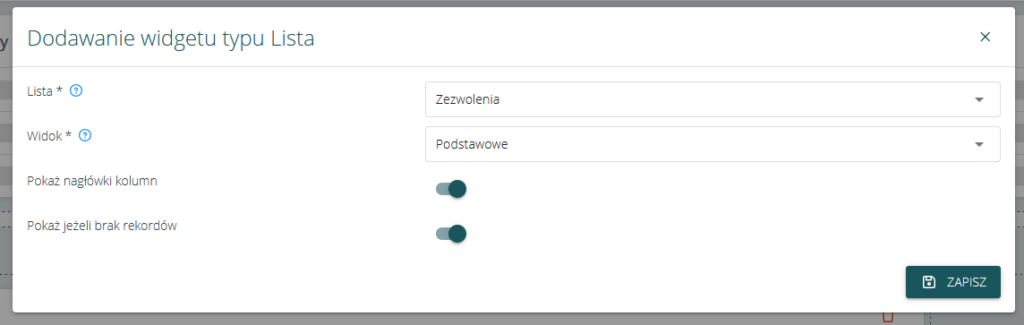 Po wyborze opcji typu Lista pojawi się okno, w którym należy wskazać z jakiej listy systemowej i jakiego widoku na niej utworzonego chcemy wyświetlać dane w widgecie oraz ustawić preferowane opcje w parametrach dot. pokazywania nagłówków w widgecie oraz zachowania widgetu w przypadku braku danych do wyświetlenia.