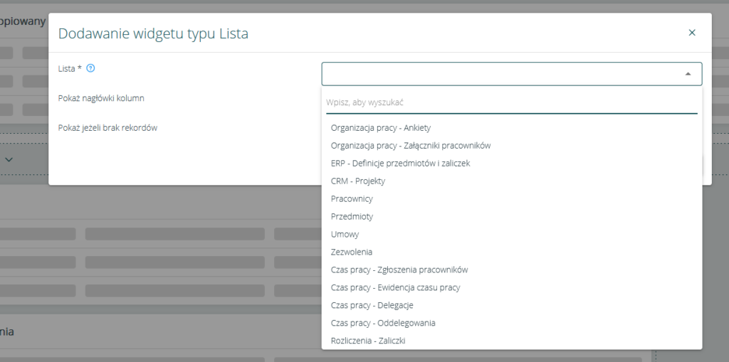 Po wybraniu kliknięciu opcji należy wskazać, czy źródłem danych widgetu będzie lista systemowa czy raport niestandardowy.