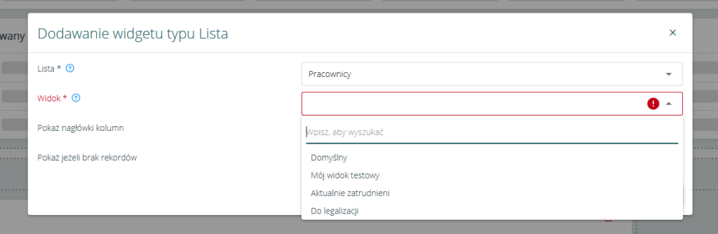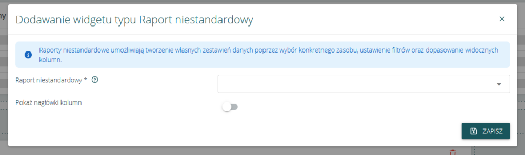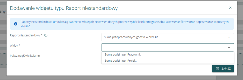 Po wyborze opcji typu Raport niestandardowy pojawi się okno, w którym należy wskazać z jakiego raportu niestandardowego widok chcemy wyświetlić oraz podobnie jak w przypadku listy ustawić preferowane opcje w parametrach dot. pokazywania nagłówków kolumn.