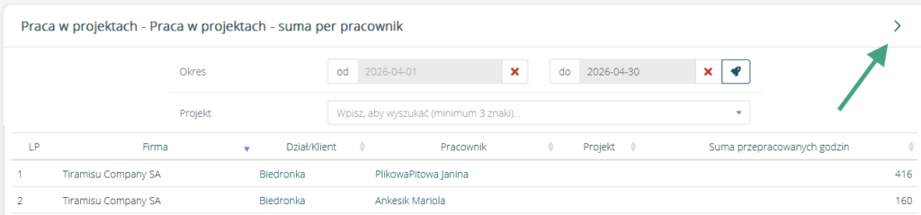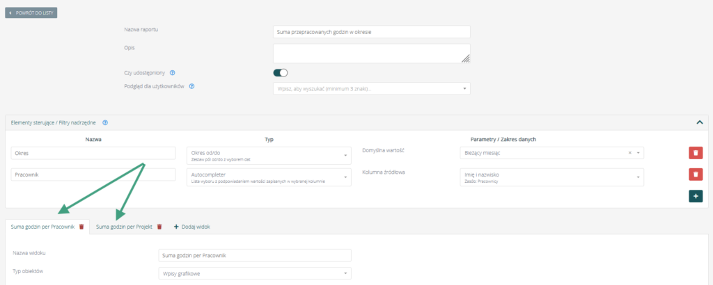 Wybór widoku danego raportu jest analogiczny jak wybór widoku z danej listy, przykładowo raport niestandardowy “Suma przepracowanych godzin w okresie“ składa się z widoków: