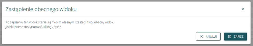 Po wprowadzeniu zmian na widoku należy je zapisać (przycisk zapisz w prawym górnym rogu ekranu). Jeśli zmian dokonano na widoku domyślnym lub współdzielonym od innego użytkownika system powiadomi, że od tej pory ustawiony układ stanie się widokiem własnym zalogowanego użytkownika.