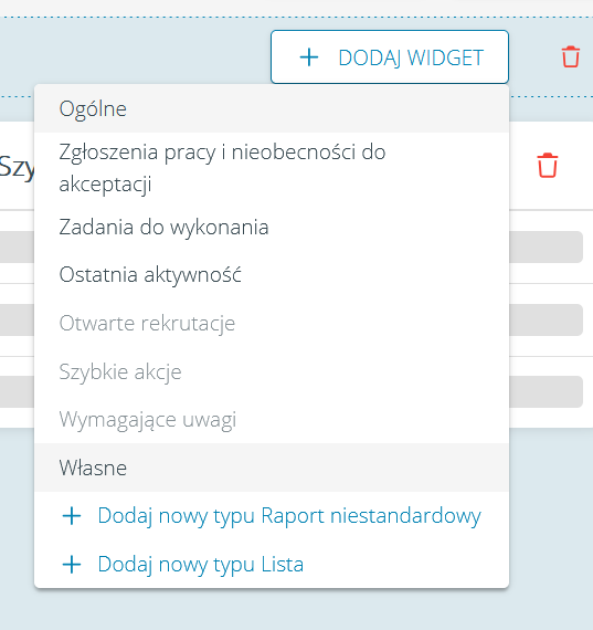 Usunięcie widgetu systemowego (zgłoszenia pracy i nieobecności do akceptacji, szybkie akcje, otwarte rekrutacje, ostatnia aktywność, zadania do wykonania, wymagające uwagi) oznacza, tak naprawdę jego ukrycie i taki widget w niezmienionej formie można zawsze przywrócić korzystając z menu dodawania widgetu.