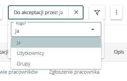 Na powyższej liście umożliwiono dodatkowo filtrowanie zgłoszeń pod względem osób, do których są one przydzielone. W tym celu dodano nową kolumnę “Do akceptacji przez” wraz z filtrami: