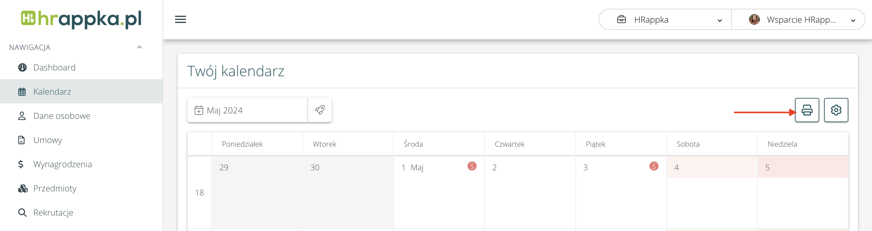 Na kalendarzu pracy, po kliknięciu w ikonę drukarki, mamy możliwość wydruku godzin pracy (wydruk obecności z grafiku pracownika):