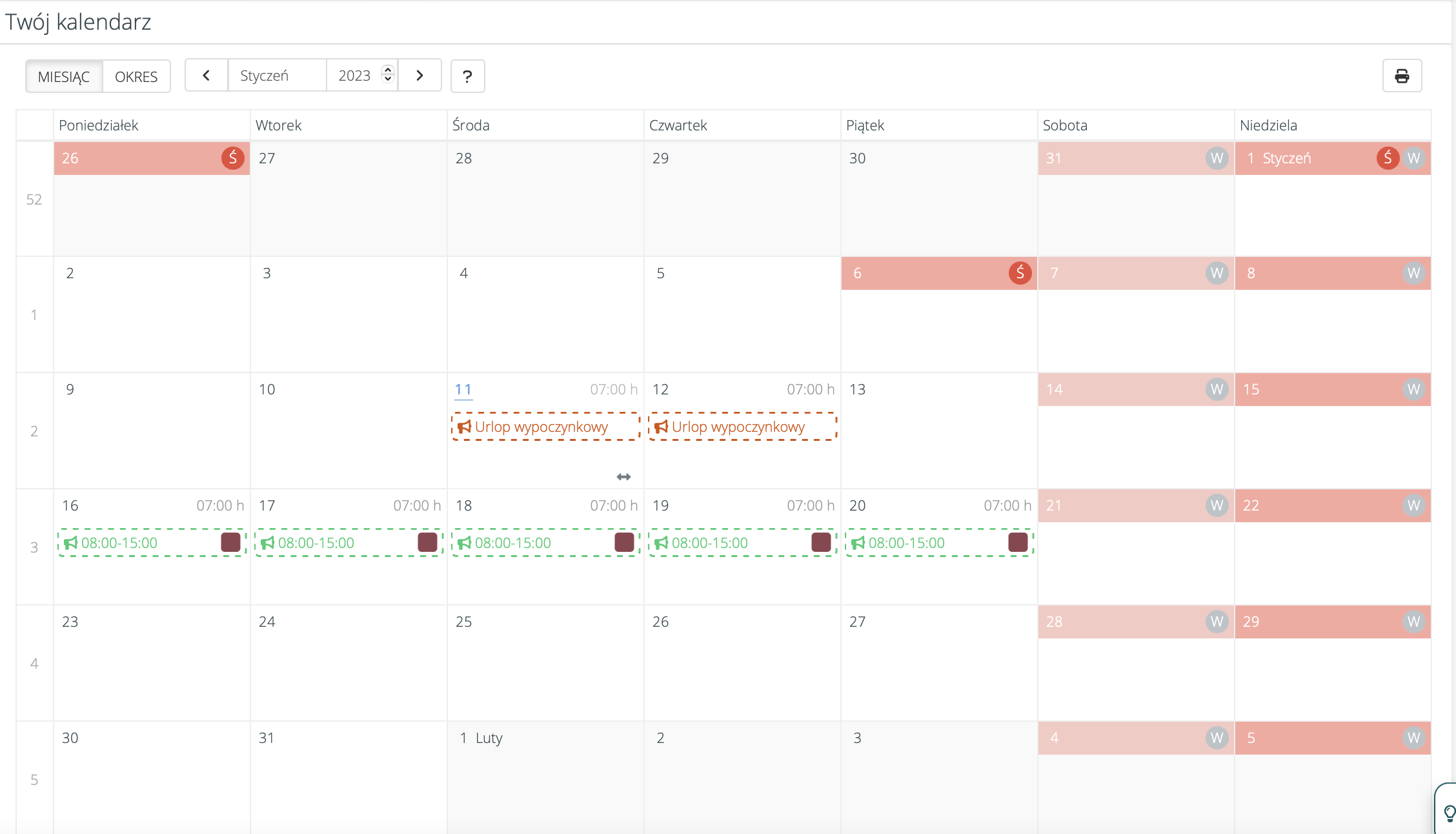 Kalendarz pozwala na zgłaszanie wpisów grafikowych (godzin pracy i nieobecności).  Pracownik ma wgląd w istniejące wpisy grafikowe, dzięki czemu może sprawdzić swój plan pracy oraz zgłoszenia godzin pracy, czy nieobecności.