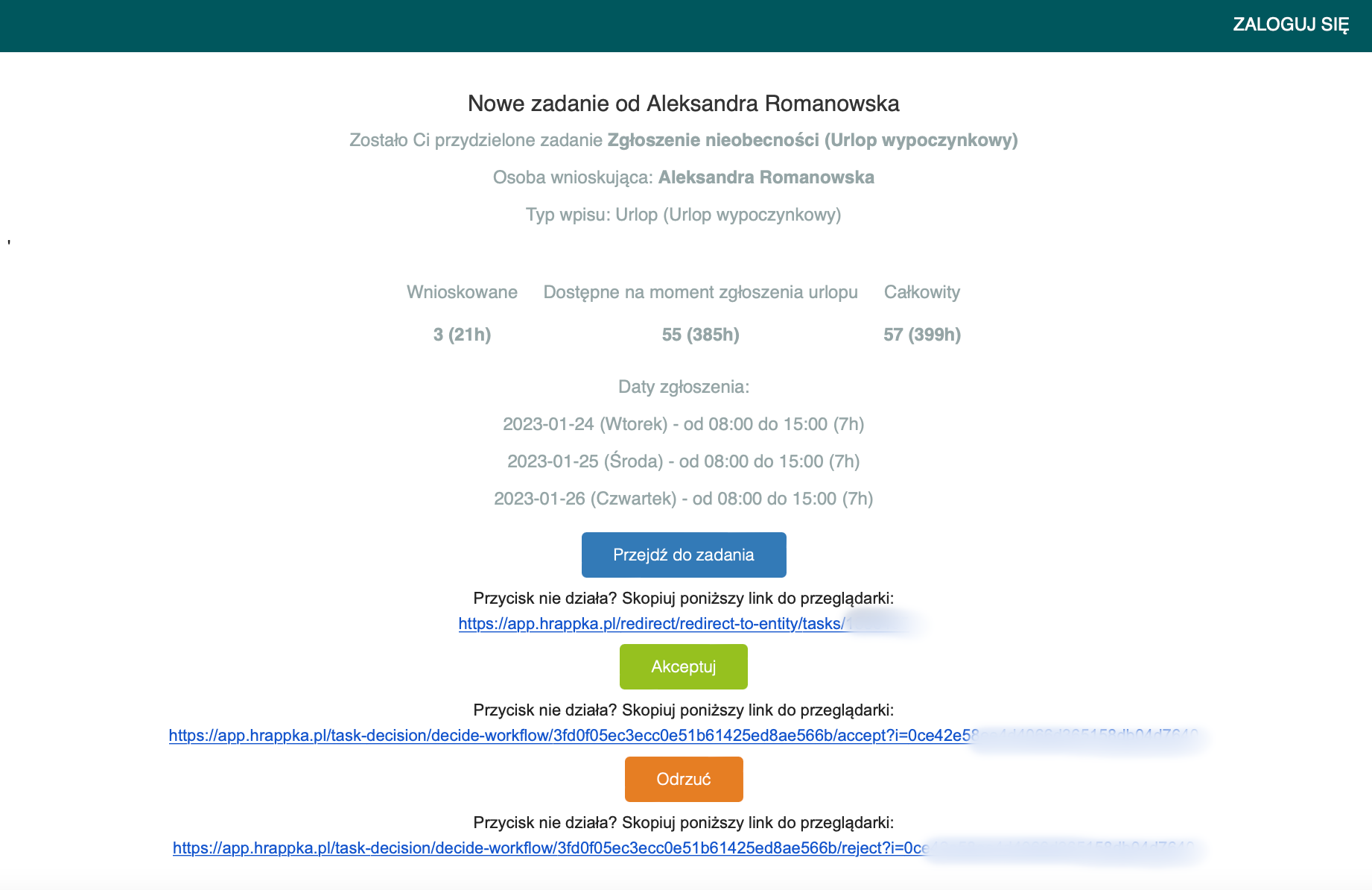 Po zgłoszeniu wpisów grafikowych przez pracownika opiekunowi pracownika przydzielane zostaje zadanie związane ze zgłoszeniem wpisów. Opiekun dostaje również notyfikację mailową. Z poziomu emaila oraz zadania może on odrzucić lub zaakceptować wpisy.