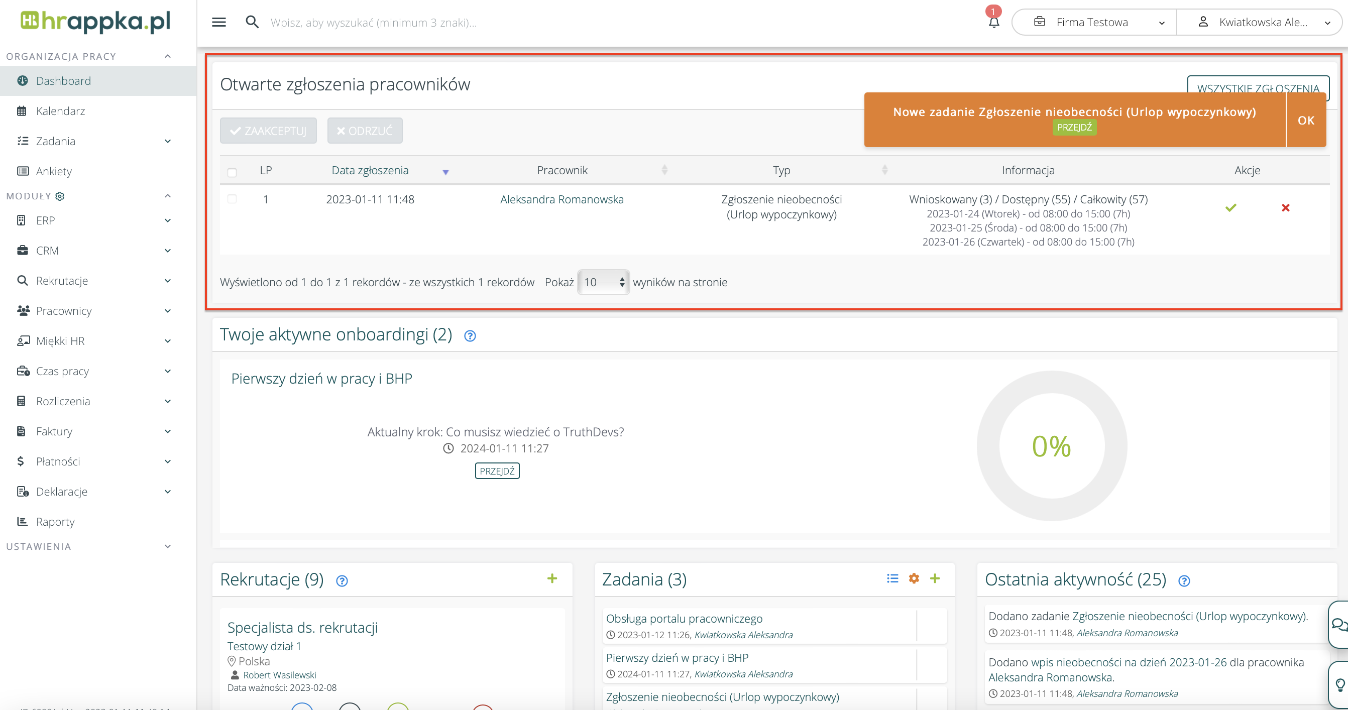 Dodatkowo, otwarte zgłoszenia pracowników prezentowane są na dashboardzie odbiorcy zgłoszenia (opiekuna pracowników). Z tego poziomu również istnieje możliwość ich zaakceptowania lub odrzucenia. Co więcej, możliwe jest przejście do przypisanego zadania lub bezpośrednio do grafiku pracownika.