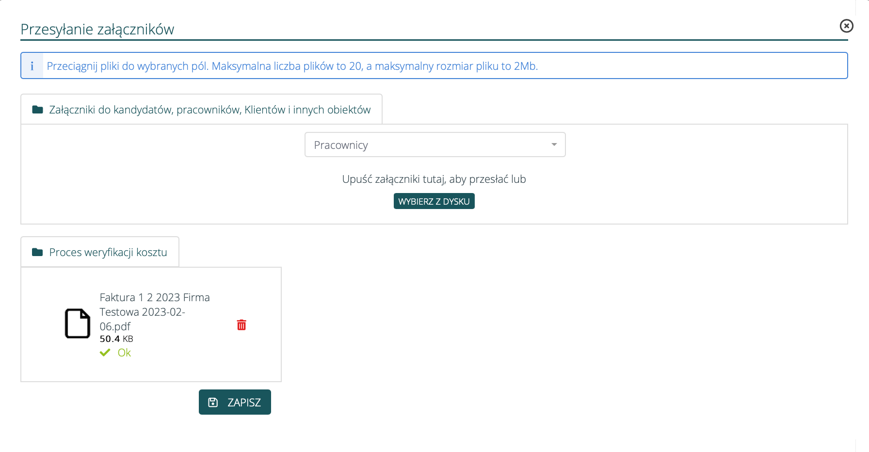 Po włączeniu modułu workflow przez pracownika systemu HRappka.pl, fakturę (skan lub pdf) można wstawić do systemu przeciągając plik z komputera do HRappki, w okno „Proces weryfikacji kosztu".