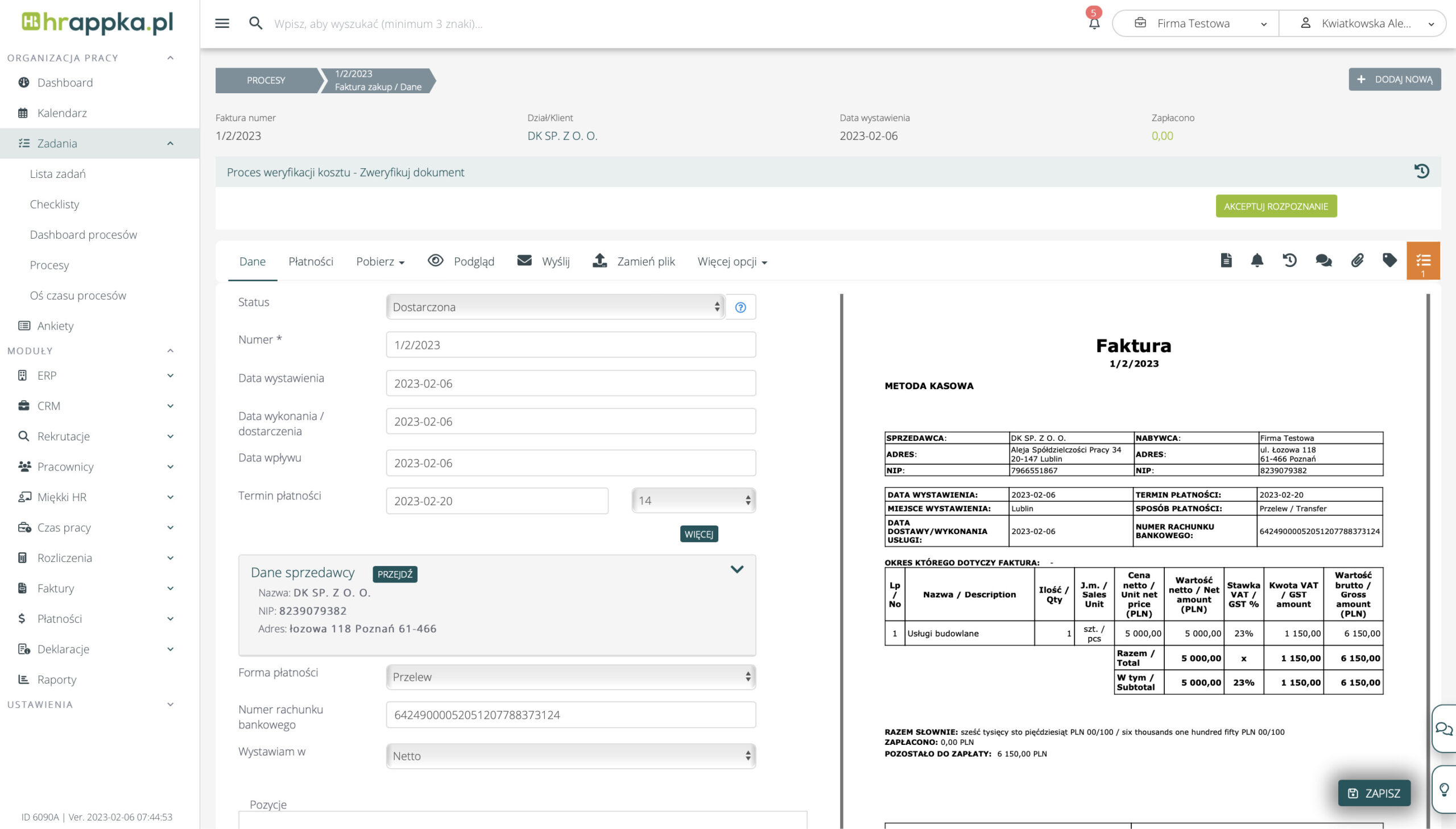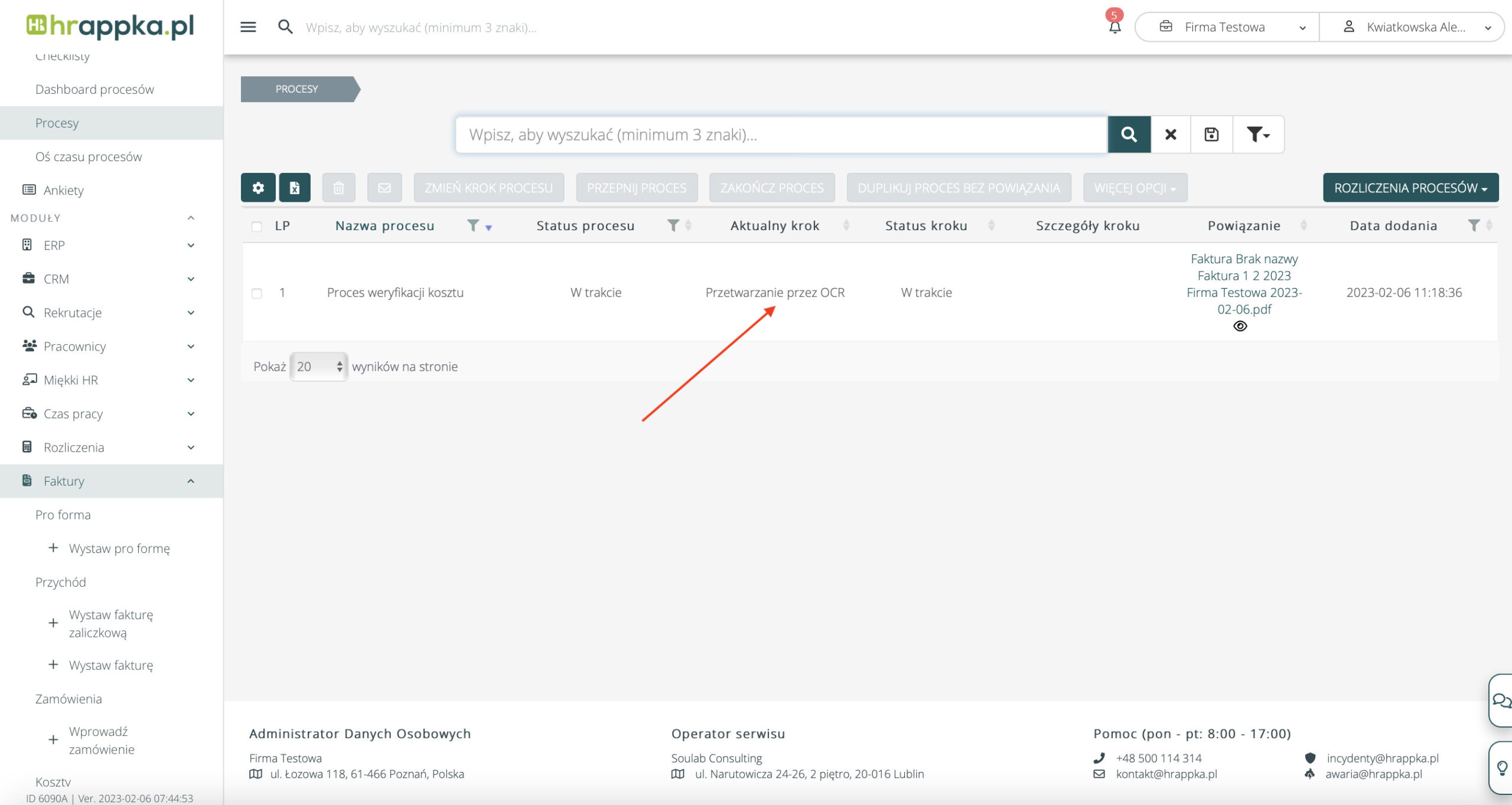 W celu włączenia modułu OCR faktur lub zbudowania przepływu faktur w systemie HRappka.pl skontaktuj się z nami.