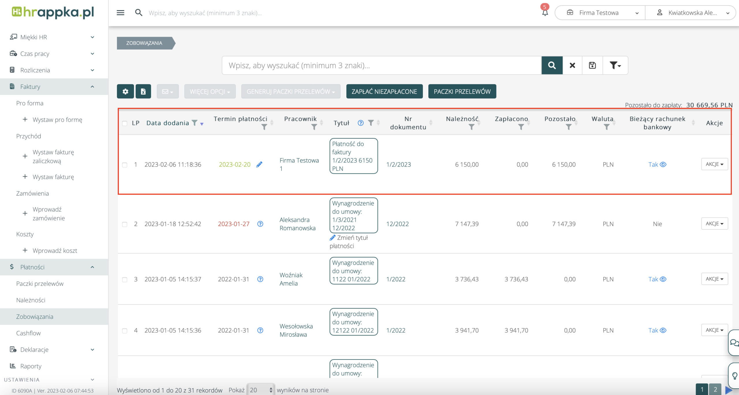 Natomiast płatności związane z daną fakturą, wraz z możliwością wysłania przelewu dostępne będą w Płatności > Zobowiązania.