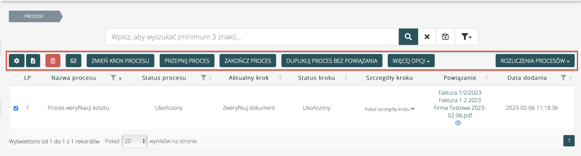 Z poziomu listy procesów istnieje możliwość przepięcia kroku weryfikacji do innego pracownika lub grupy pracowników, zmiany kroku (cofnięcia) oraz zakończenia procesu. W tym celu należy skorzystać z przycisków znajdujących się nad tabelą.