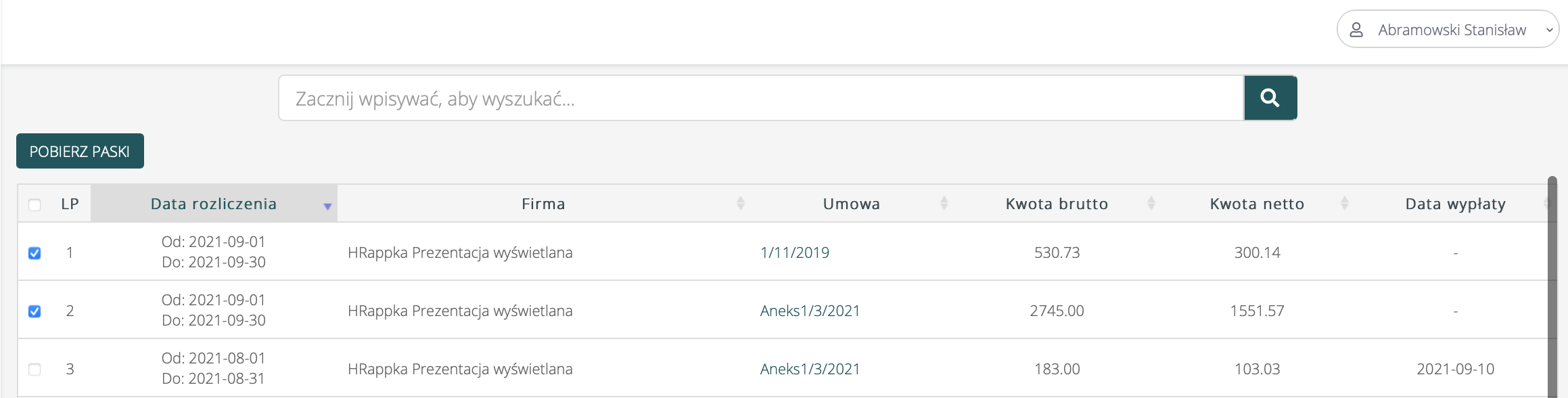 Pracownik po zalogowaniu na swoje konto będzie mógł wejść w zakładkę Wynagrodzenie, w której jest lista wynagrodzeń pracownika. Przycisk “Pobierz paski” pozwala pobrać szczegóły wynagrodzenia. Należy zaznaczyć wybrane rekordy i kliknąć ten przycisk.