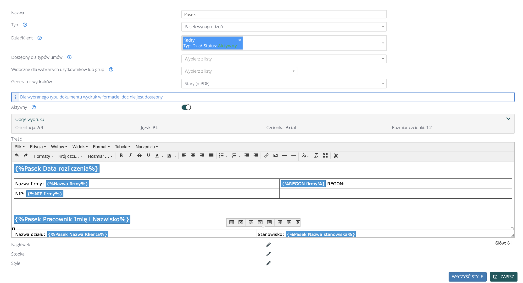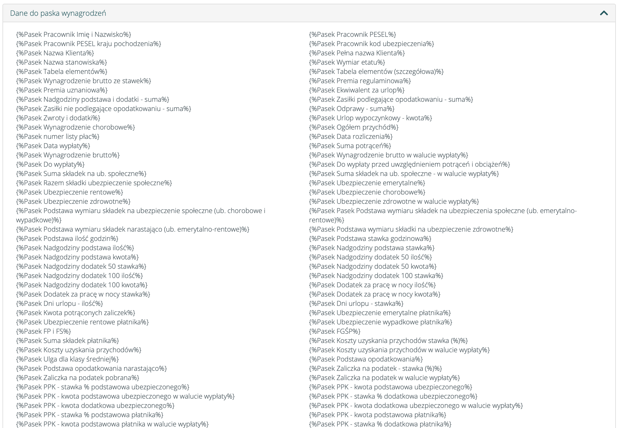 Lista wszystkich dostępnych znaczników dla pasków wynagrodzeń znajduje się na dole strony, pod instrukcją używania znaczników: