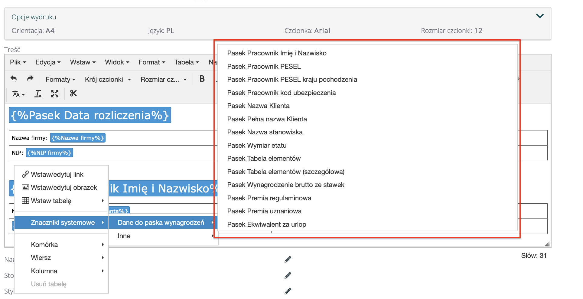Aby użyć znacznika należy kliknąć prawym przyciskiem myszy i wybrać opcję Znaczniki systemowe, a następnie pożądany znacznik: