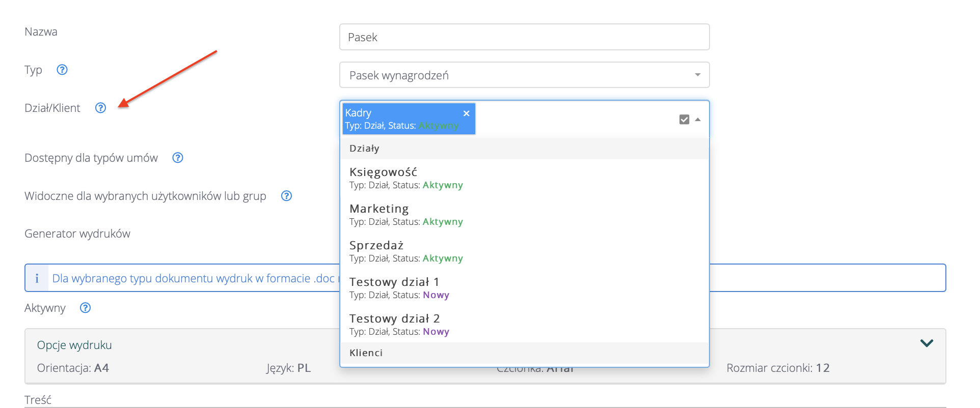 Istnieje także możliwość konfiguracji osobnych wydruków pasków dla danego Klienta/Działu – należy kliknąć “Dodaj nowy wydruk, wpisać jego nazwę, wybrać typ Pasek wynagrodzeń i z listy wybrać Klientów/Działy dla których pasek ma być używany. Jeśli pole z Klientem/Działem jest pozostawione puste to dany wydruk paska będzie domyślnie używany dla wszystkich Klientów/Działów w Firmie.