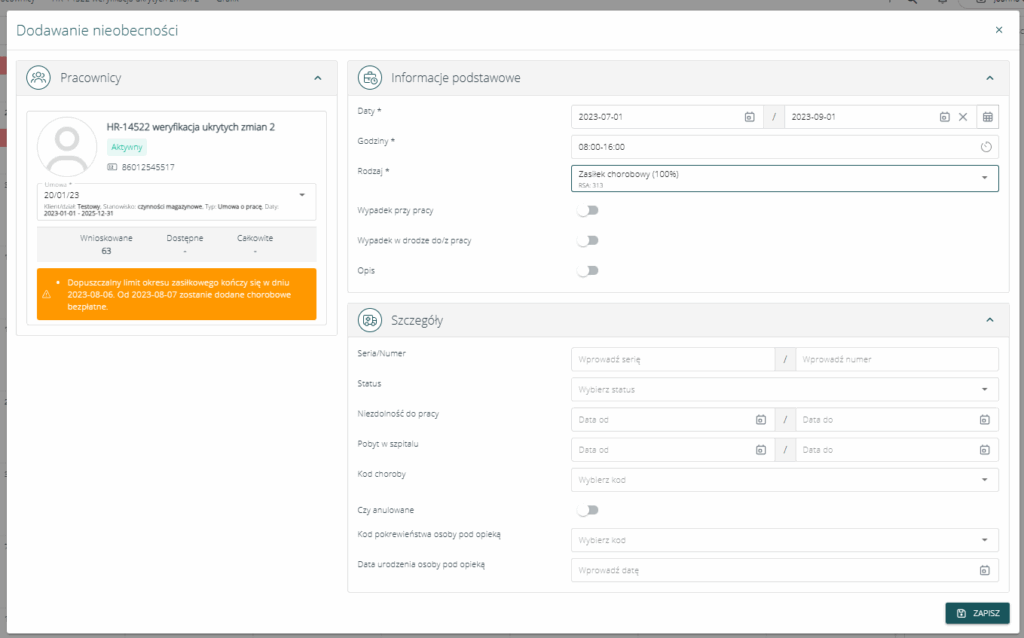 Dotychczas system pozwalał na wprowadzanie wpisów chorobowego lub zasiłku na dowolny okres, bez weryfikacji przysługującego prawa do świadczenia. Oznaczało to, że klienci samodzielnie musieli kontrolować, czy dana osoba powinna mieć wpis zasiłku, czy inny wpis w grafiku.