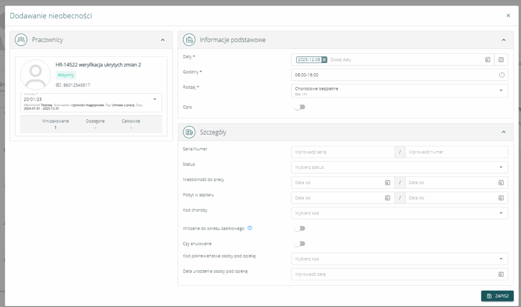 - Automatyczne sprawdzanie, czy dodawany wpis przekracza okres zasiłkowy.