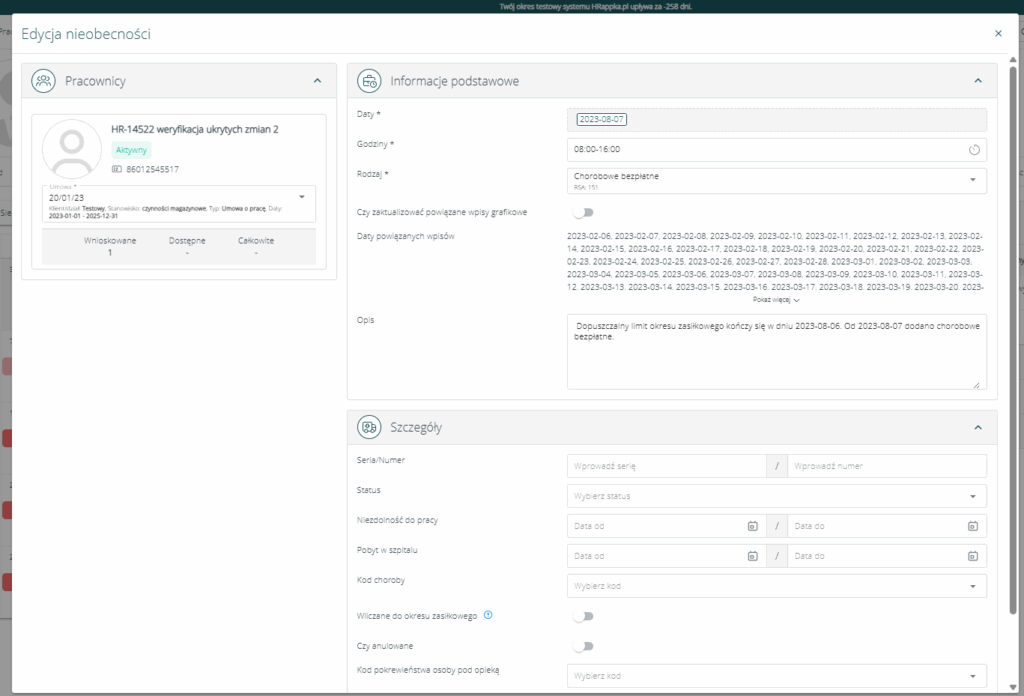 W przypadku, gdy w systemie znajdują się wpisy poza limitem okresu zasiłkowego, system ich nie skonwertuje – konwersja dotyczy wyłącznie nowych wpisów dodawanych po przekroczeniu okresu zasiłkowego.