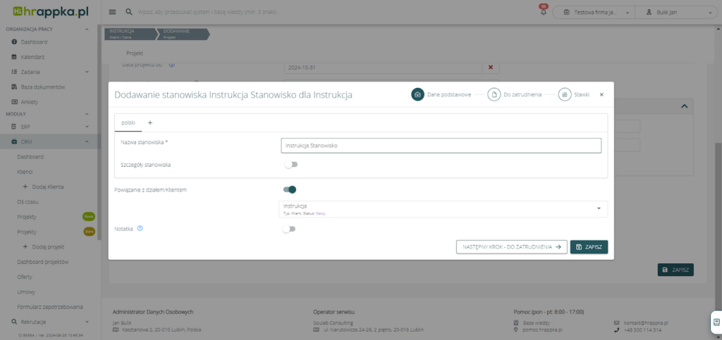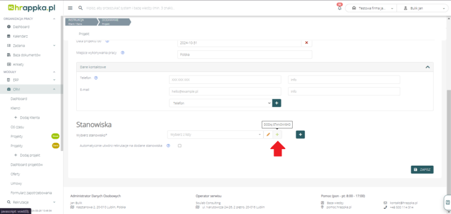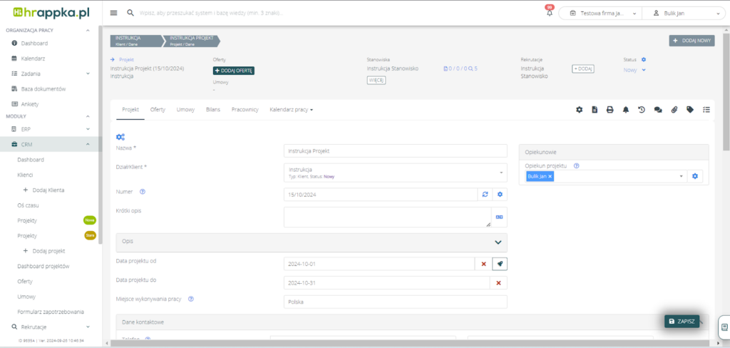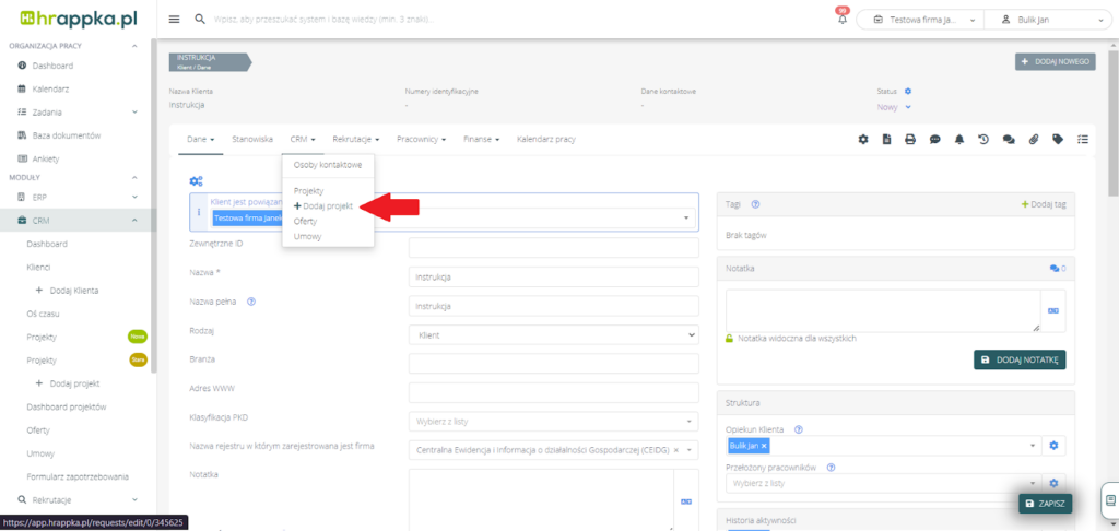 Aby dodać projekt wejdź w zakładkę CRM na profilu klienta, a następnie wybierz “+ Dodaj projekt” i uzupełnij formularz. Więcej informacji o projektach, znajdziesz na stronie: https://pomoc.hrappka.pl/baza-wiedzy/projekty-w-systemie/