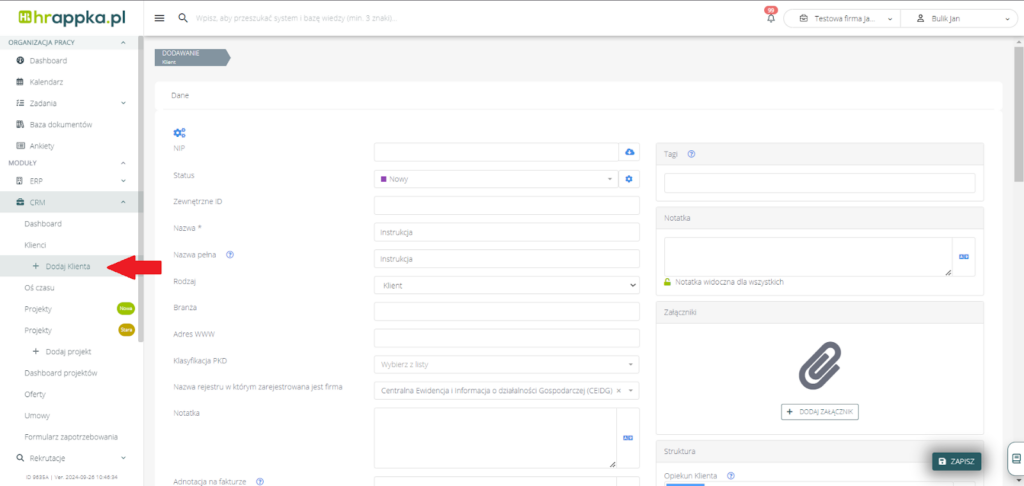 Aby dodać nowego klienta przejdź do zakładki CRM w menu i kliknij “+ Dodaj Klienta”, a następnie uzupełnij formularz. Więcej informacji dotyczących profilu klienta znajduje się na https://pomoc.hrappka.pl/baza-wiedzy/profil-klienta-funkcjonalnosci/