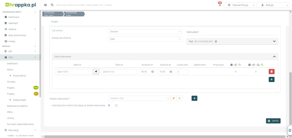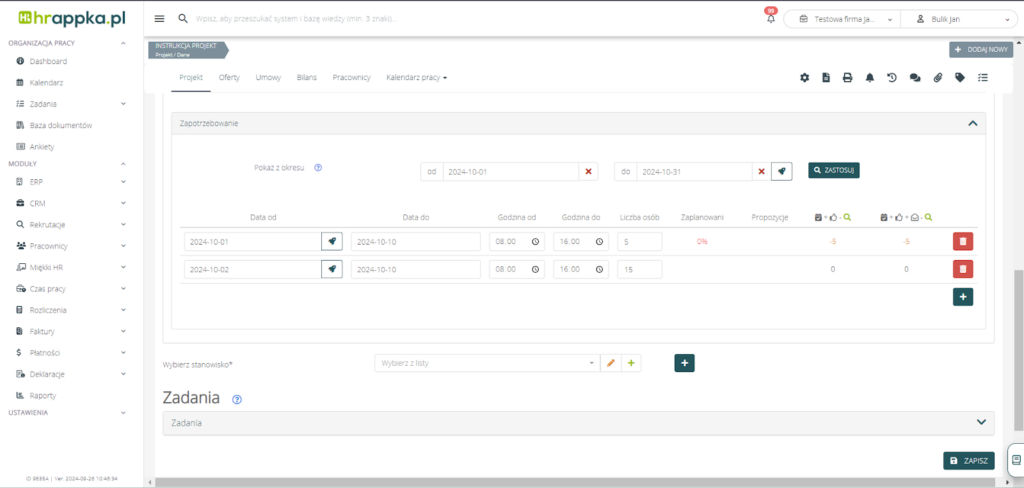 Po dodaniu stanowiska w projekcie, należy uzupełnić dane dotyczące zapotrzebowania na tą pozycję. Wprowadzamy daty, godziny oraz ilość osób których potrzebujemy na danym stanowisku.