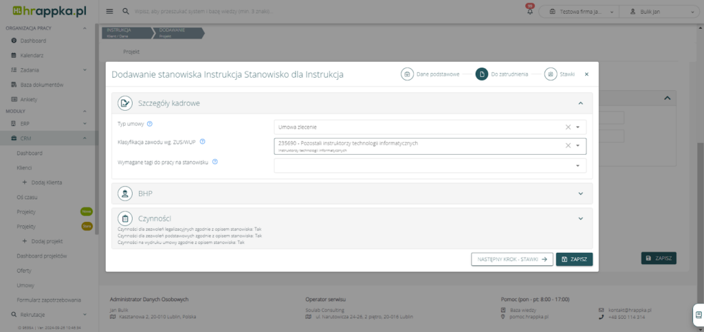 Aby dodać stanowisko na projekcie, przejdź do sekcji stanowiska i kliknij w zielony “+” i uzupełnij dane dotyczące stanowiska takie jak “Nazwa stanowiska”, “Szczegóły stanowiska”, “Typ Umowy”, “Kod zawodu” oraz “Stawki” przedstawione w poniższych krokach.