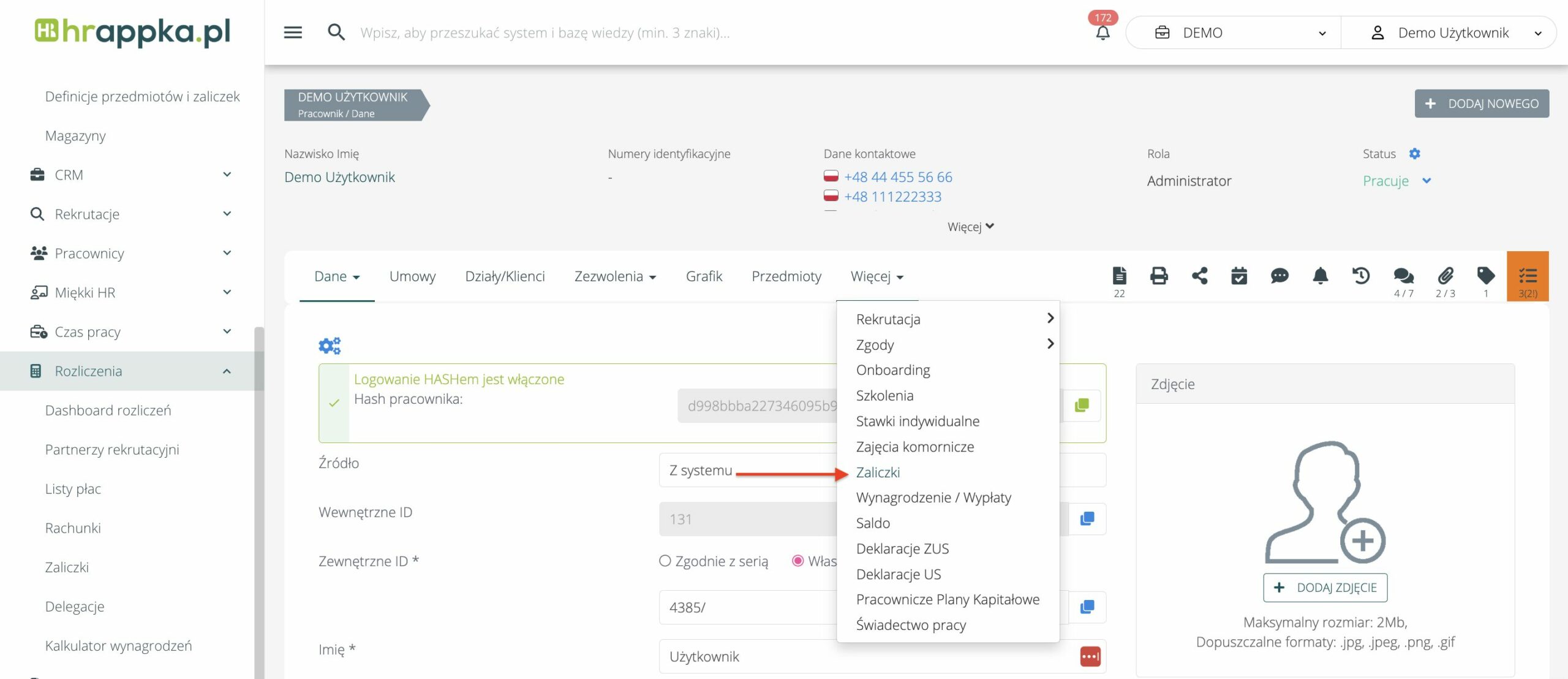 Dodawanie zaliczki jest dostępne z poziomu zakładki Więcej > Zaliczki na profilu pracownika (Przycisk „Dodaj zaliczkę”).