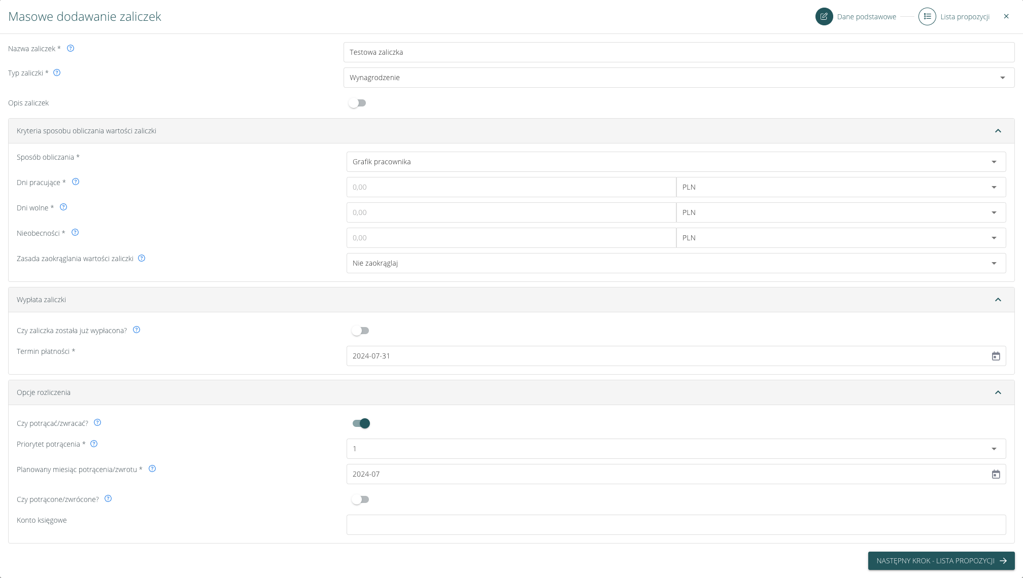 Formularz masowego dodawania zaliczki składa się z dwóch kroków: danych zaliczki i listy propozycji.