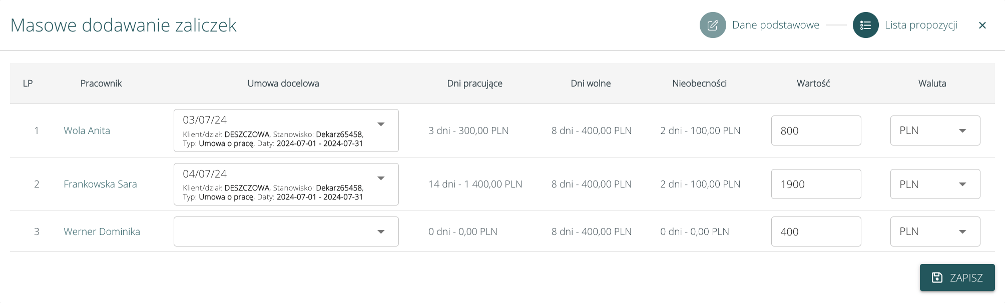 W drugim kroku, na liście propozycji, przy każdym pracowniku możemy wybrać umowę do której chcemy powiązać zaliczkę.