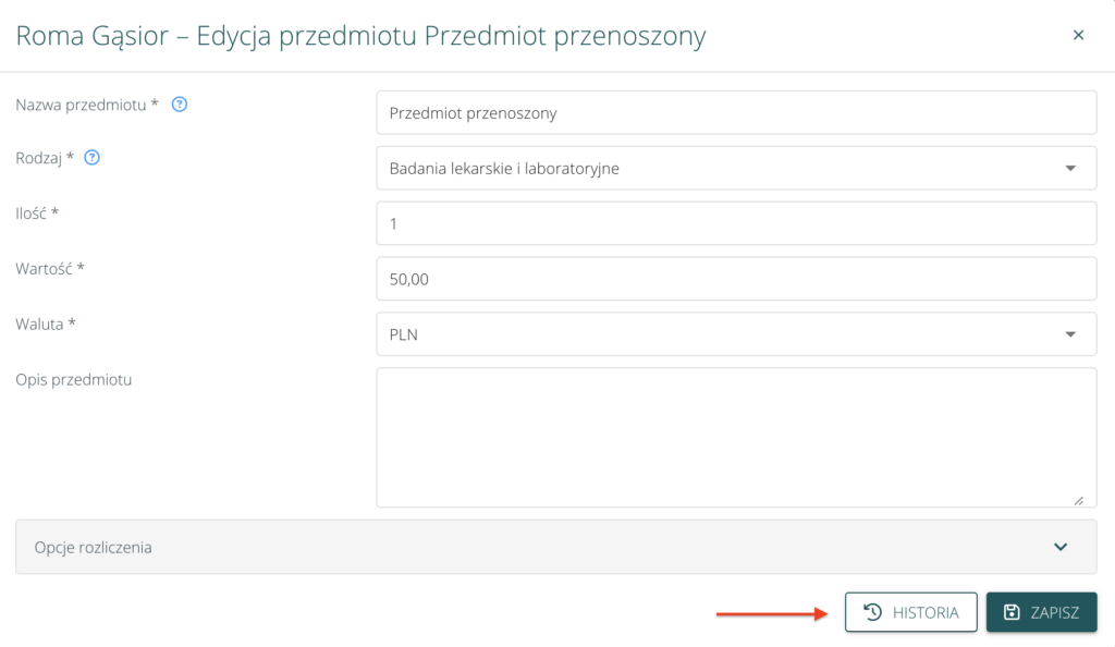 Na formularzu edycji przedmiotu / zaliczki, historia jest dostępna na dole formularza, przy przycisku Zapisz: