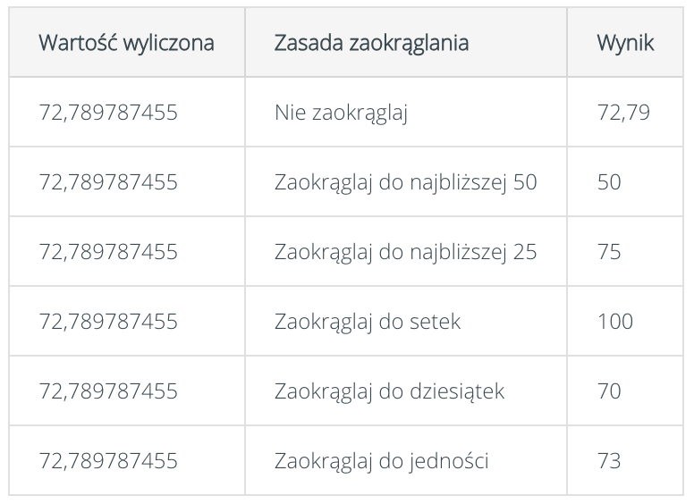 - Zasada zaokrąglania wartości zaliczki – Należy wybrać sposób zaokrąglania wyliczonych wartości. Przykładowe wyniki zaokrąglania przedstawiono w tabeli poniżej. Wybór opcji “nie zaokrąglaj” oznacza, że system zachowa do 2 znaczących miejsc.