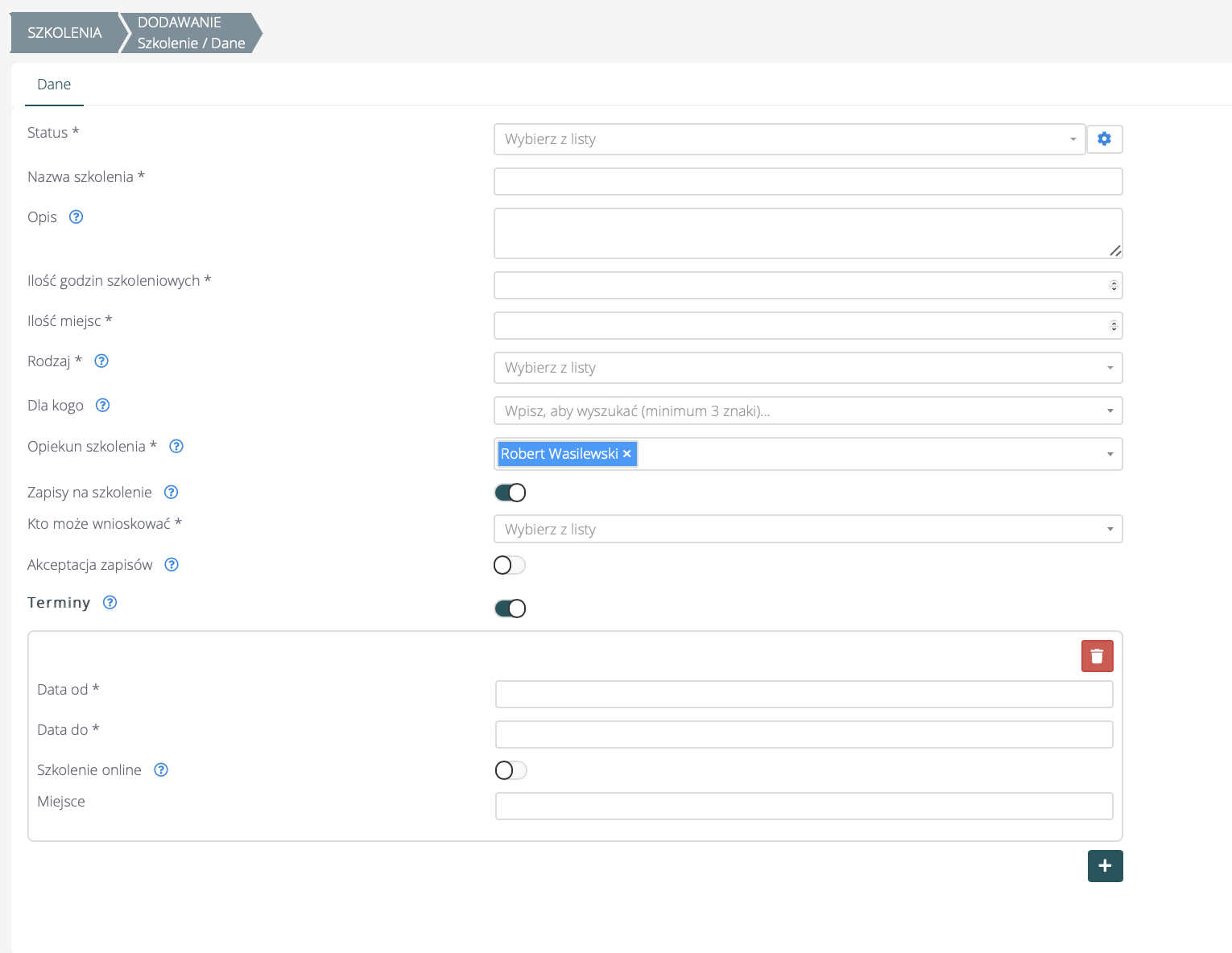Zbierz wszystkie dane, które wyświetlane są na formularzu dodawania szkolenia: