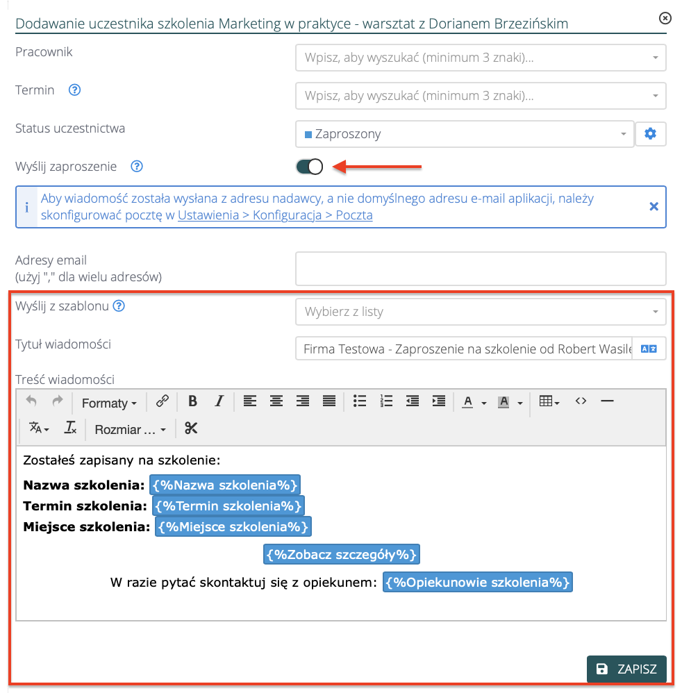 Możesz samodzielnie stworzyć szablon wiadomości, jaka będzie wysyłana pracownikowi, podczas zapraszania go na szkolenie (w Ustawienia > Szablony > Wydruki. ,dodając wydruk o typie „Szablon wiadomości”).