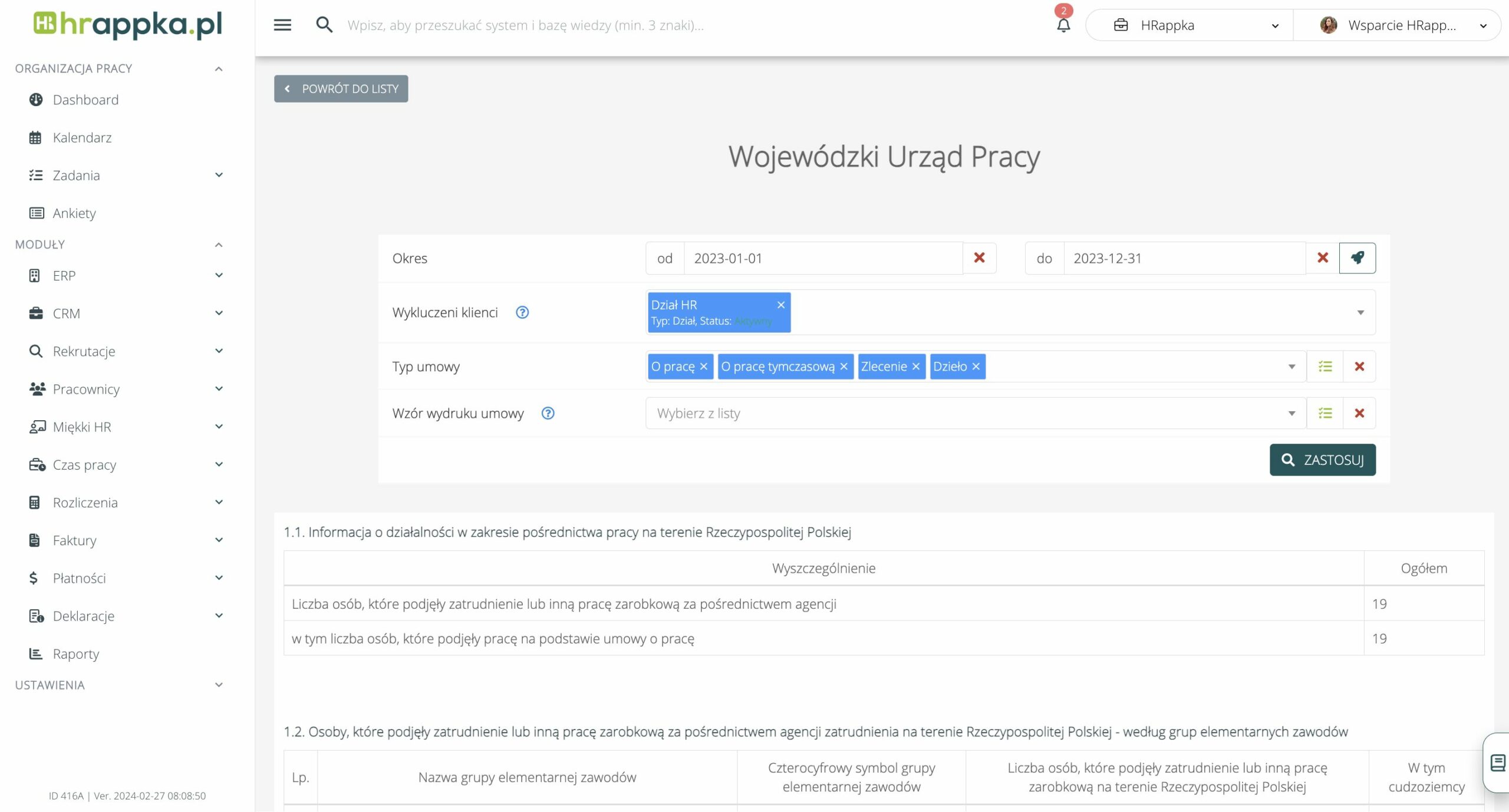 Raport do WUP znajduje się w module Raporty. Raport ten sumuje pracowników, którzy byli zatrudnieni w danym okresie. Raport zlicza wyłącznie umowy ze stanowiskami, które posiadają zdefiniowaną „Nazwę zawodu” na stanowiskach, które przypisane są do umów, aktywnych w danym roku.