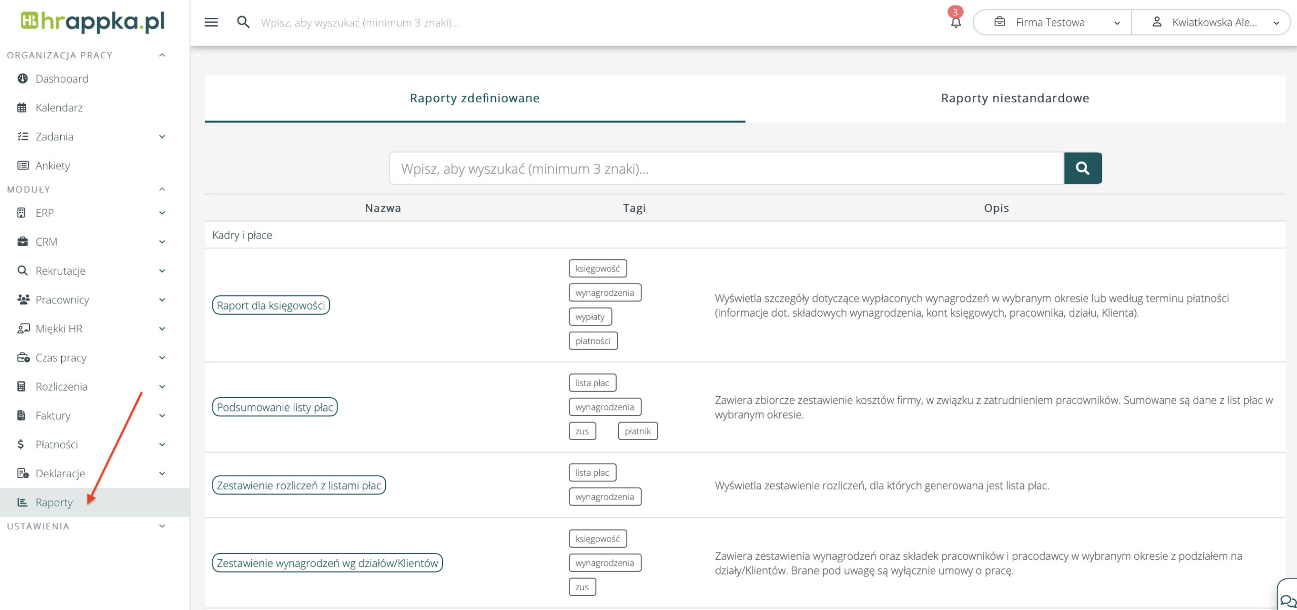 Raporty zdefiniowane znajdziesz na dole menu, w zakładce Raporty > Raporty zdefiniowane.