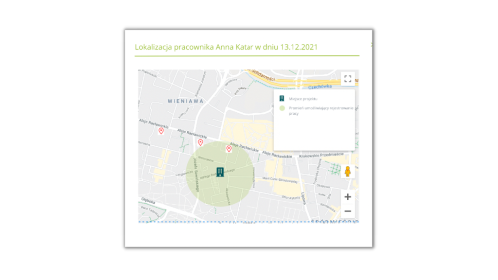 Po kliknięciu w ikonę pinezki możemy sprawdzić lokalizację pracownika w czasie, gdy podczas rejestrowania czasu pracy znajdował się poza lokalizacją miejsca pracy: