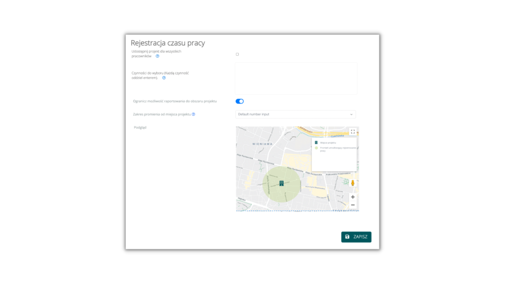 Jeżeli opcja ograniczenia raportowania do obszaru projektu nie będzie włączona w ustawieniach projektu – pracownik będzie mógł rejestrować czas pracy niezależnie od swojej lokalizacji.