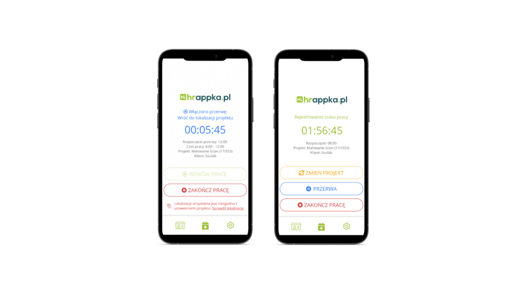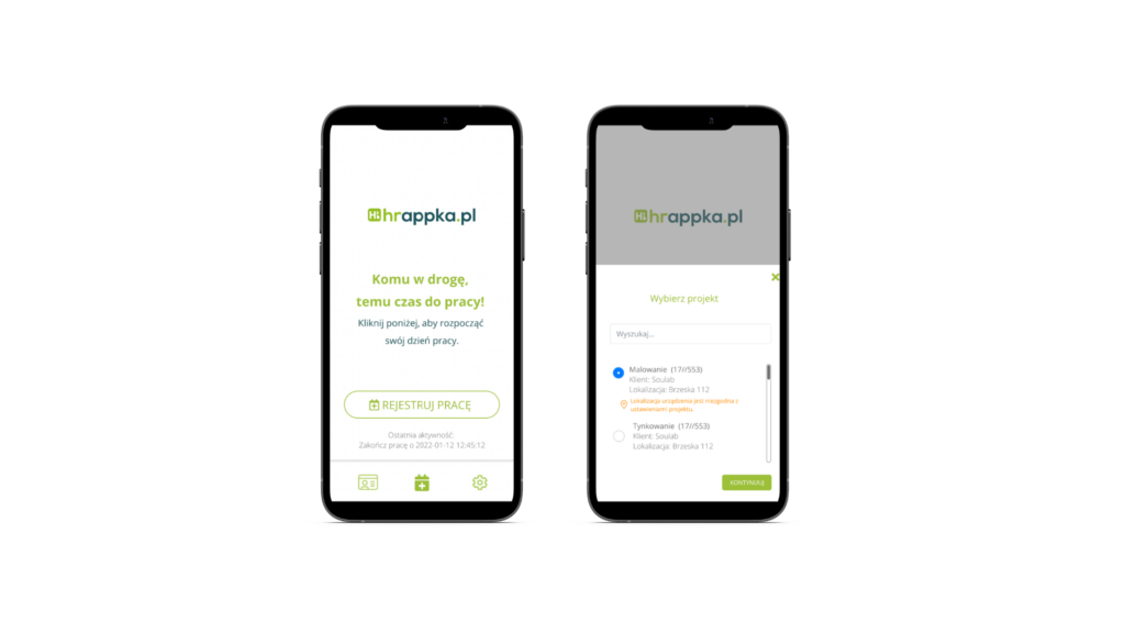 Pracownik powiązany z dodanym projektem będzie mógł rejestrować swój czas pracy za pomocą telefonu z włączoną lokalizacją oraz zainstalowanej aplikacji mobilnej HRappka, tylko jeżeli posiada dostęp do portalu pracownika.