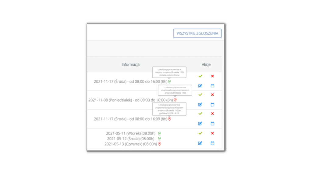 Każdy zarejestrowany wpis grafikowy pracownika pojawi się do zatwierdzenia na dashboardzie osoby wyznaczonej do akceptacji wpisu (zgodnie ze ścieżkami akceptacji wpisów grafikowych). Pojawi się również informacja dotyczącą lokalizacji pracownika podczas czasu pracy.