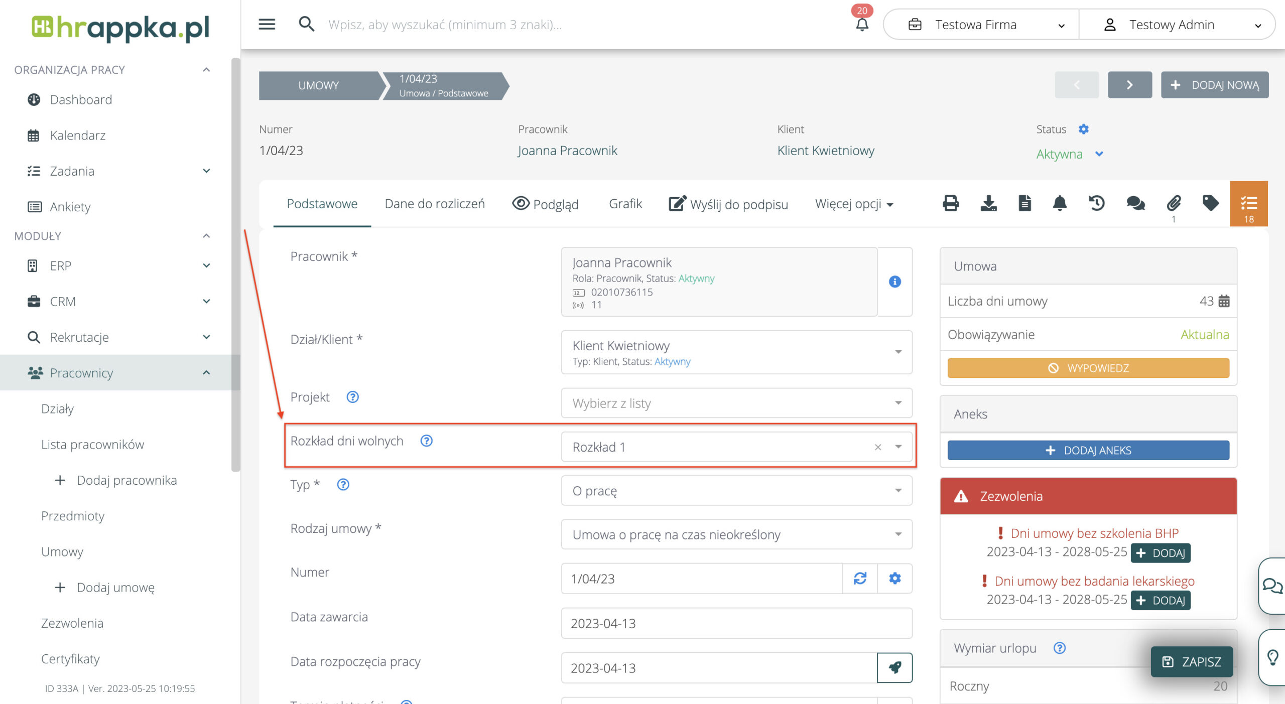 Rozkład dni wolnych można definiować na umowie pracownika, w polu „Rozkład dni wolnych”: