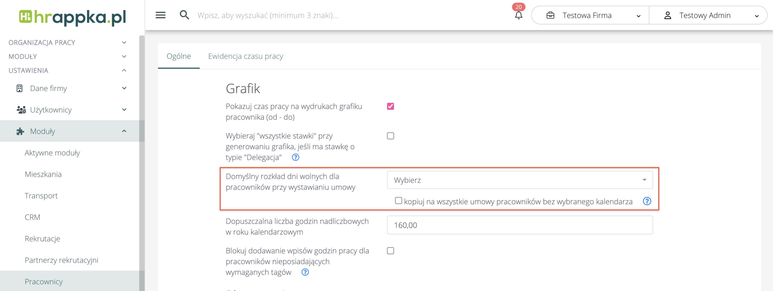 Domyślny rozkład dni wolnych (dawniej kalendarz pracy) ustawiany na umowach z pracownikami będzie pobierany z Ustawienia firmy > Moduły >Pracownicy > sekcja Grafik > opcja „Domyślny rozkład dni wolnych dla pracowników”:
