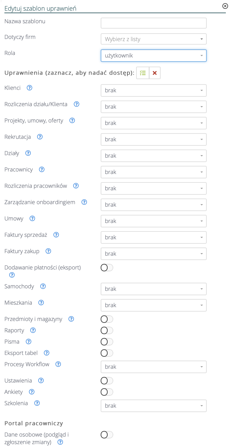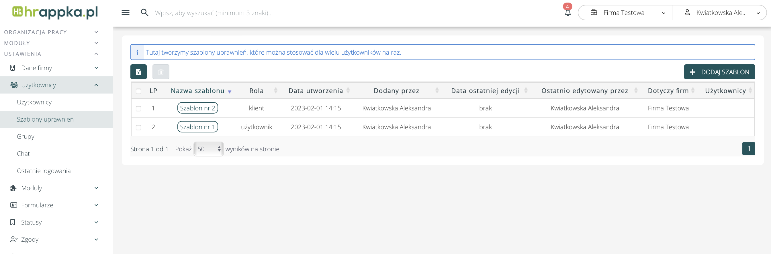 W Ustawienia > Użytkownicy > Szablony uprawnień możliwe jest tworzenie szablonów uprawnień, które stosować można dla wielu użytkowników naraz: