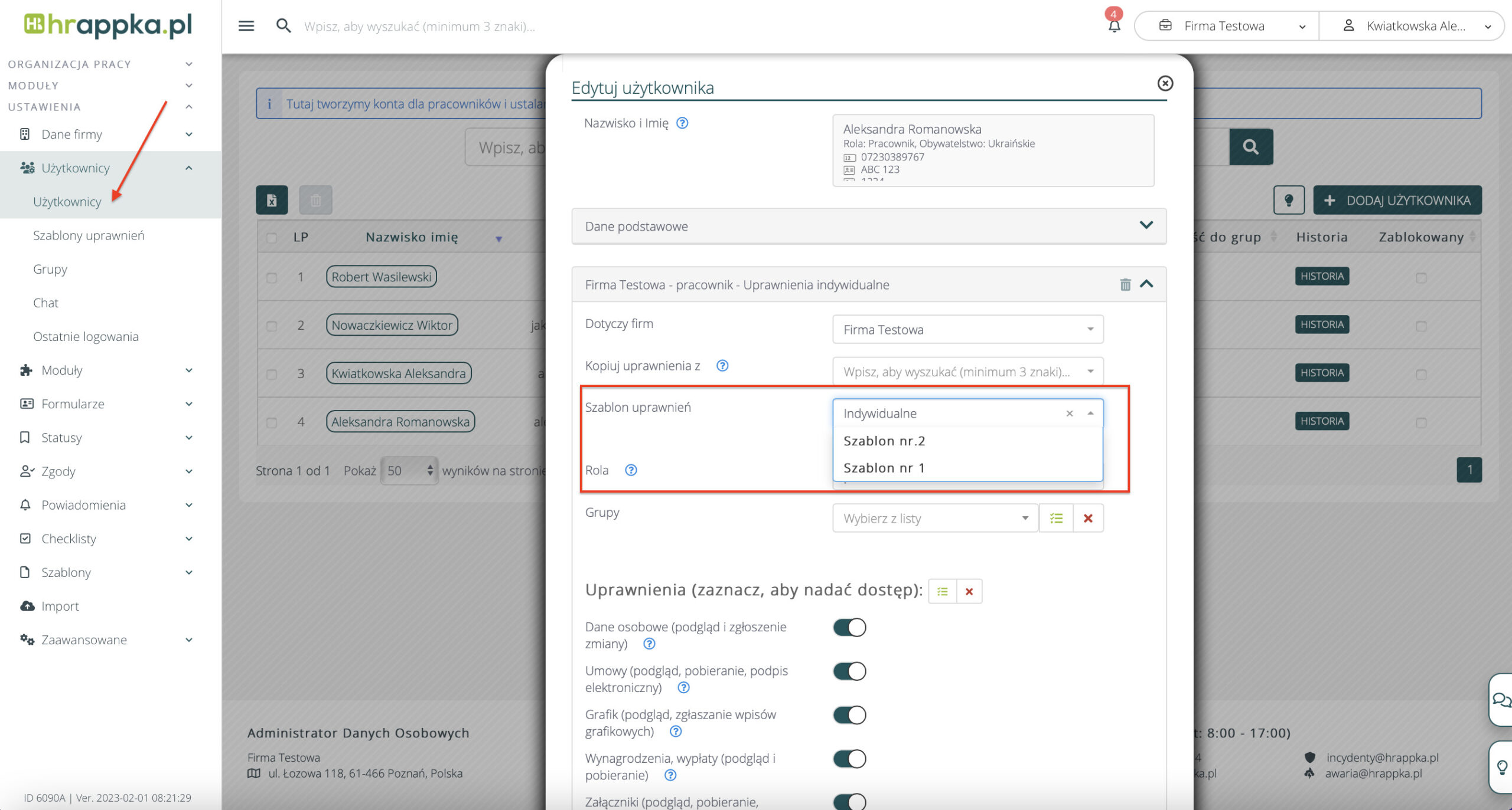 W ustawieniach firm (do których dostęp ma użytkownik), dodana została opcja „Szablon uprawnień”. Domyślnie ustawiona jest „indywidualne”, natomiast po wyborze szablonu uprawnień, ich edycja zostaje zablokowana: