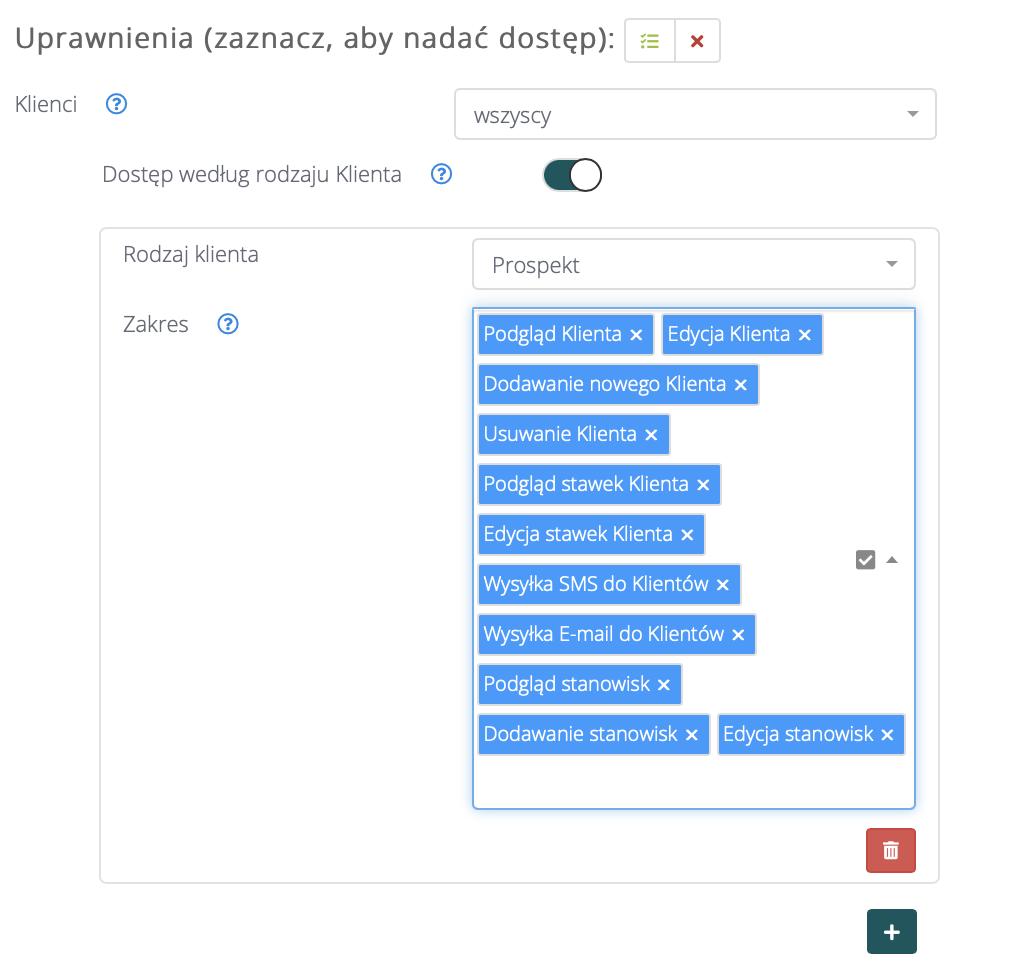 Jest to rola, która posiada dostęp do wszystkiego w systemie, nie można jej ograniczyć dostępu. Tylko administrator może zarządzać ustawieniami systemu w zakresie danych firmy oraz użytkowników dodawanych do systemu. Co więcej, tylko administrator może usuwać wszystkie obiekty w systemie. Za tą rolę konta w systemie pobierana jest opłata Jest to rola, która może posiadać dostęp do wszystkich modułów w systemie. Użytkownik może pracować na wszystkich obiektach w systemie, ale możliwe jest również wielopłaszczyznowe ograniczenie jego dostępu do danych/modułów w systemie. Podczas dodawania / edycji roli użytkownik możliwa jest konfiguracja dostępu: Możemy sparametryzować dostęp: Dostęp według rodzaju Klienta: Włączając tą opcje będziesz miał możliwość zdefiniowania zakresu uprawnień oddzielnie dla każdego rodzaju Klienta, dla przykładu użytkownik może mieć inny zakres uprawnień dla Klientów o typie „Dostawca szkoleń" lub „Mieszkanie", a inny do Klientów o typie „Prospekt".
