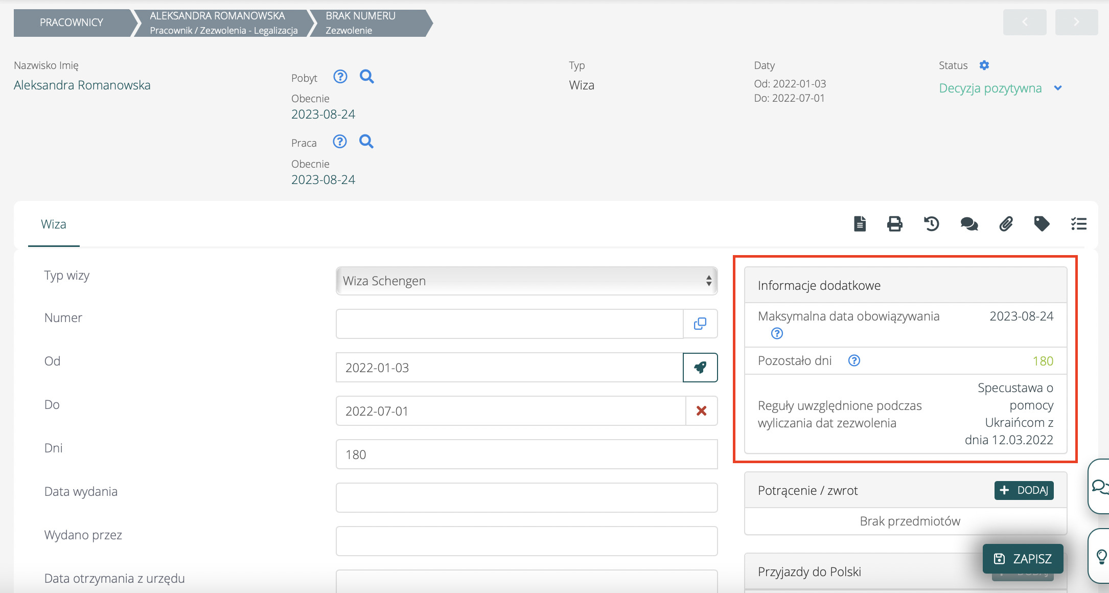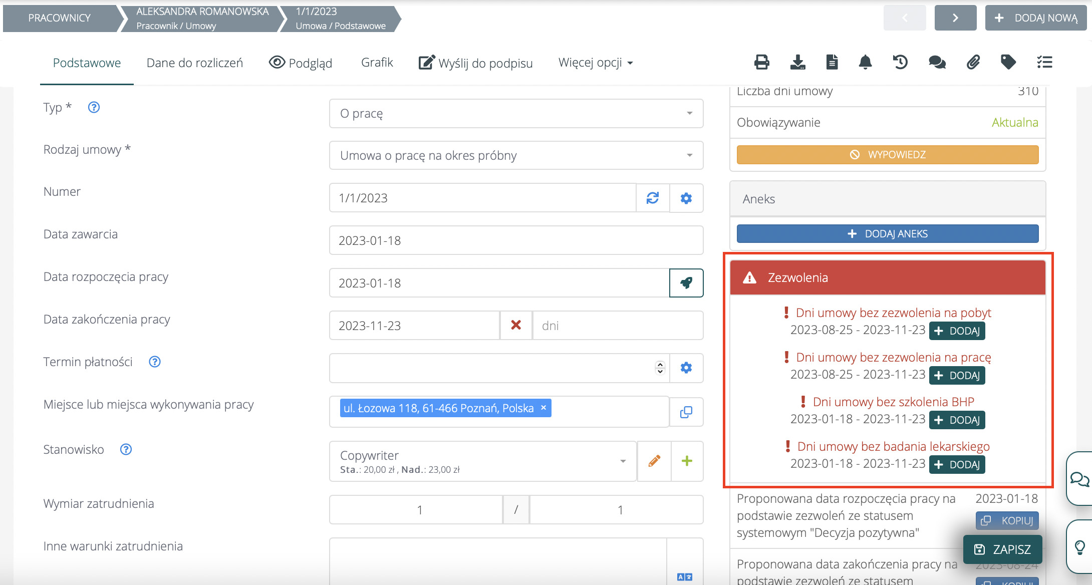 Na umowie, która wystawiona jest na termin dłuższy niż dokument legalizujący pobyt lub pracę, system poinformuje Cię, na jakie dni cudzoziemiec nie ma zezwolenia.