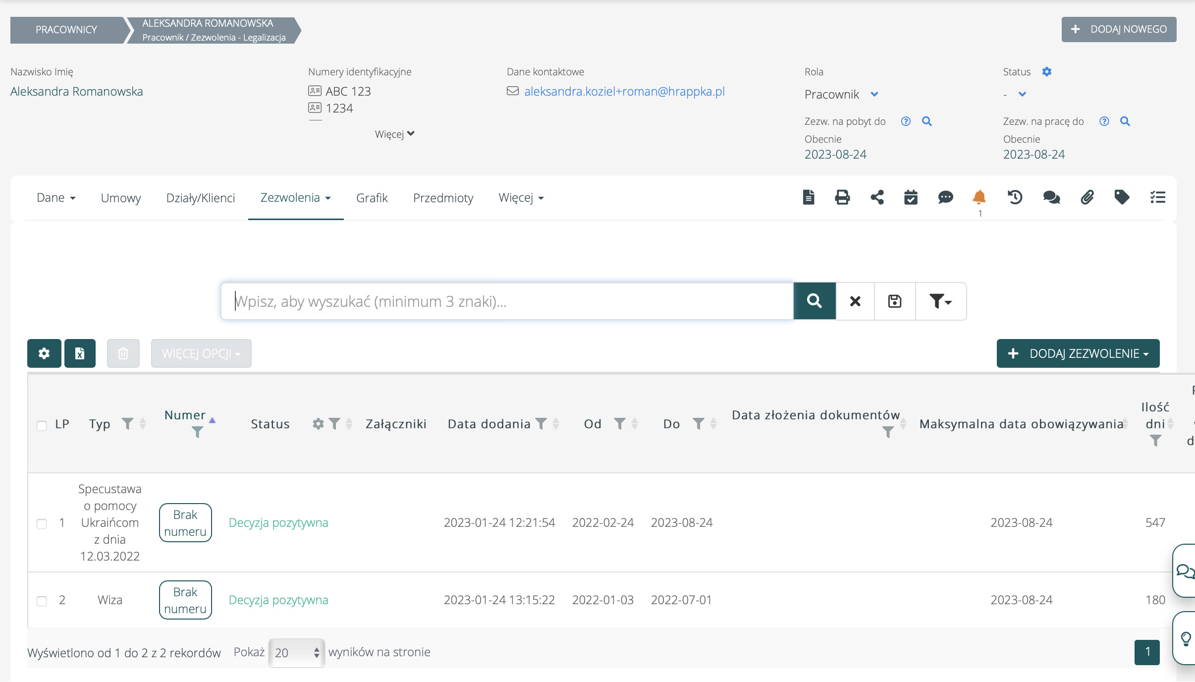 W profilu pracownika dostępne są wszystkie dodane zezwolenia/oświadczenia na pracę i dokumenty wjazdowe (wiza, paszport, paszport biometryczny).