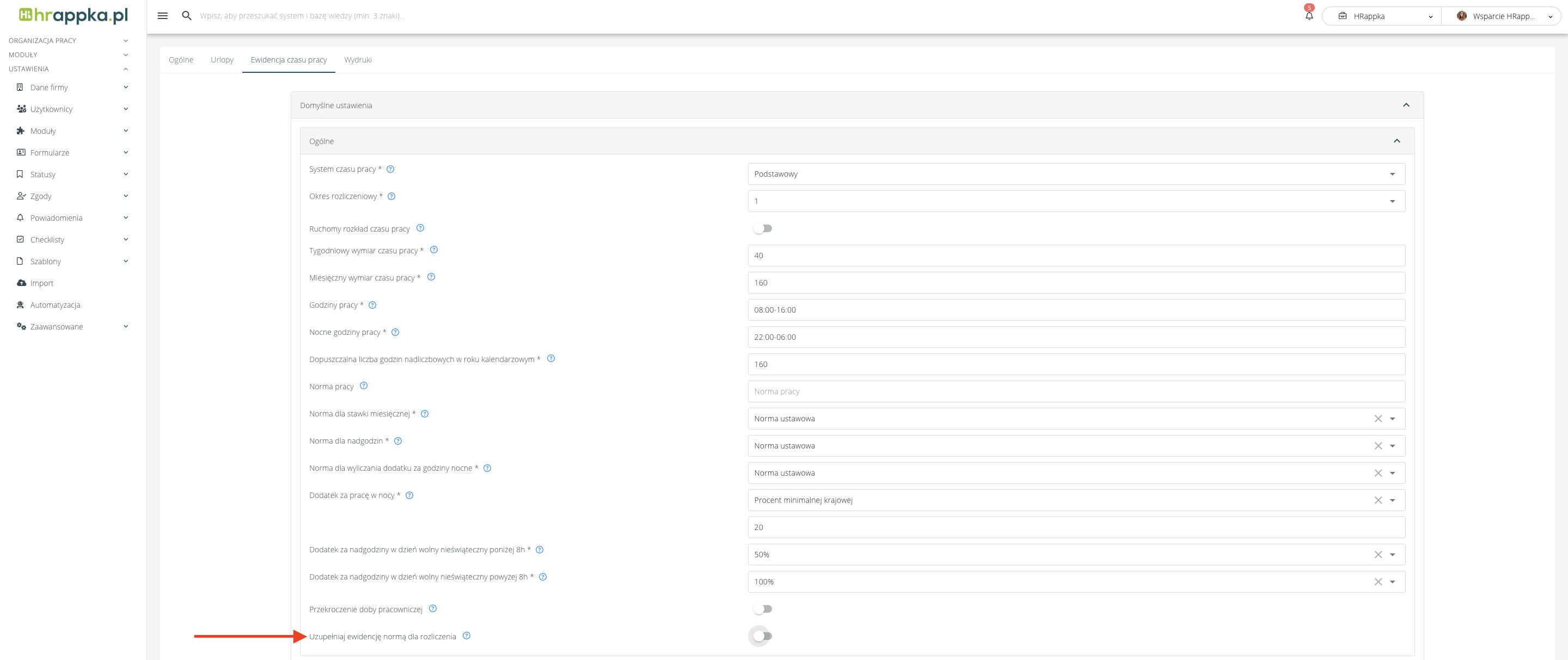 HRappka posiada ustawienie, które pozwali automatycznie uzupełniać grafiki pracownika normą. Jeżeli w grafiku nie ma wpisów pracy, to włączenie opcji spowoduje, że wpisy godzin pracy zostaną automatycznie wygenerowane w momencie dodawania rozliczenia zgodnie z normami lub planem pracy pracownika. Opcja dotyczy tylko umów o pracę.