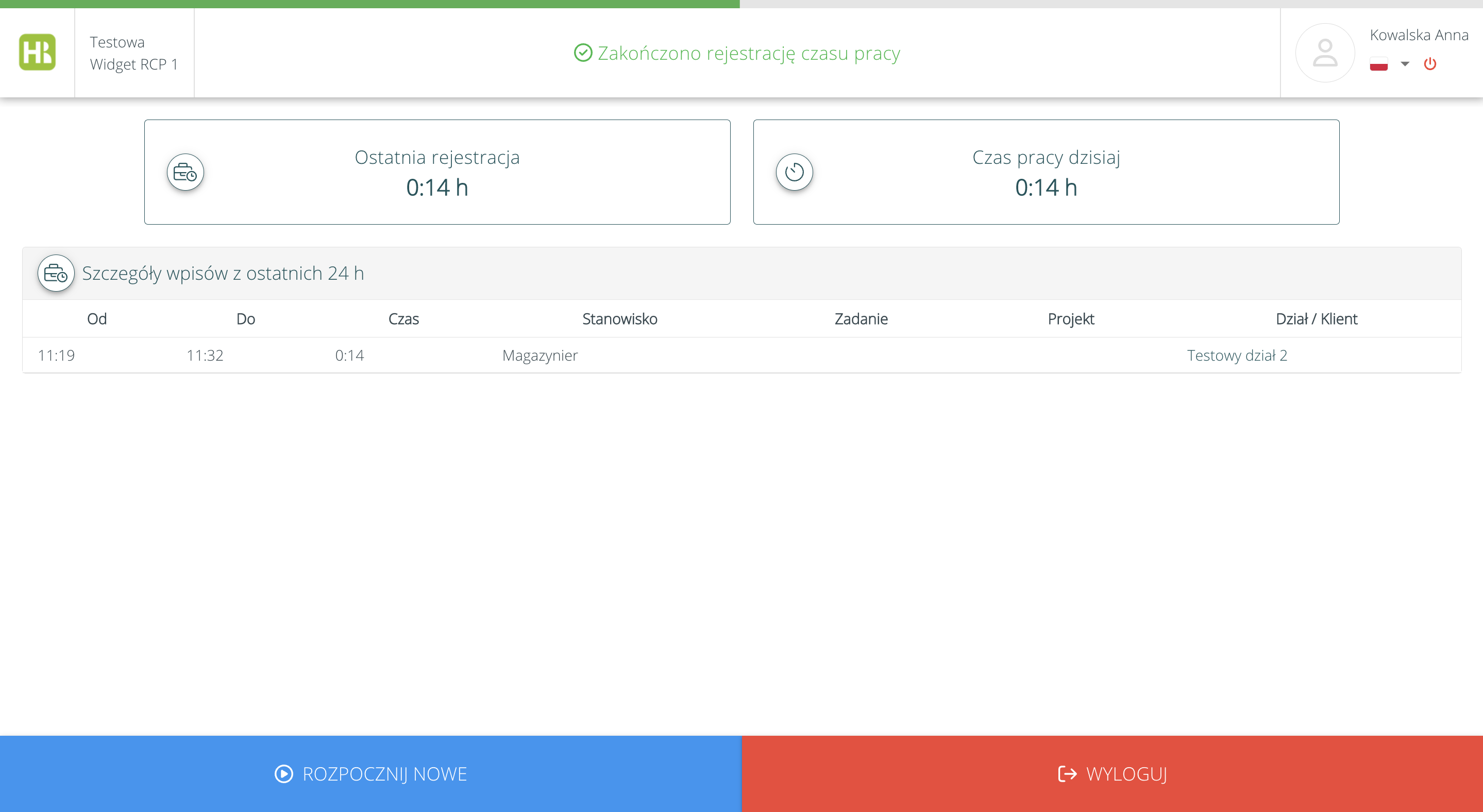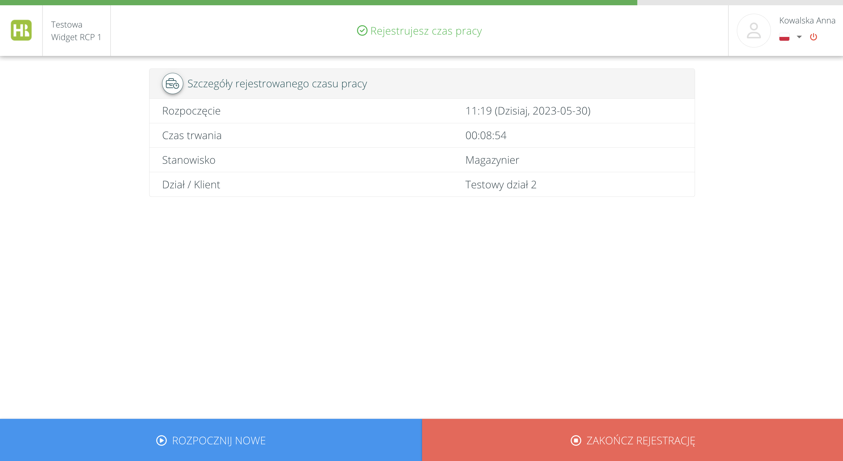 Po ponownym zalogowaniu się do widgetu, pracownik zobaczy szczegóły jego rejestracji czasu pracy oraz będzie mógł zakończyć rejestrację czasu pracy lub rozpocząć nową (na inne parametry, jeżeli może rejestrować czas pracy na więcej niż 1 element), korzystając z przycisków na dole ekranu:
