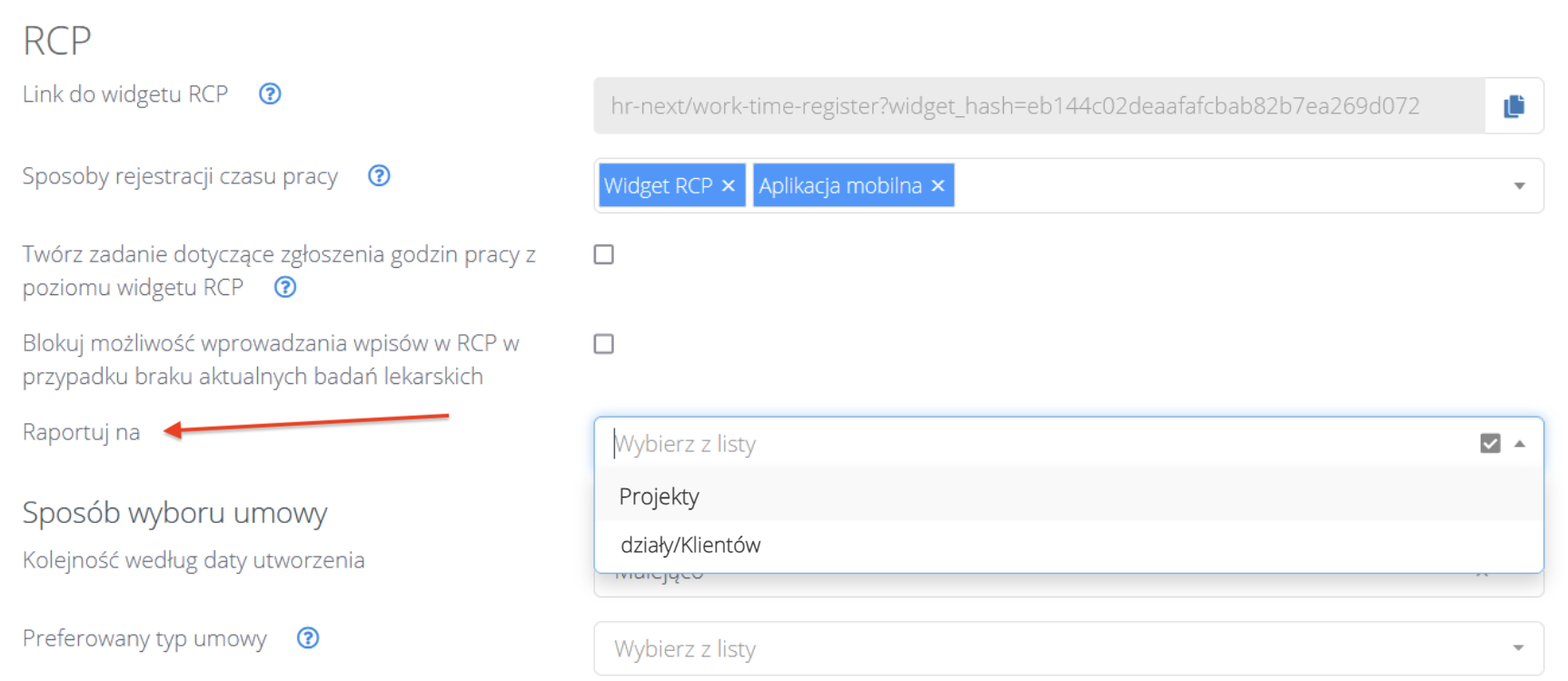 W Ustawienia > Moduły > Pracownicy > Sekcja RCP dodano nową opcję “Raportuj na”: